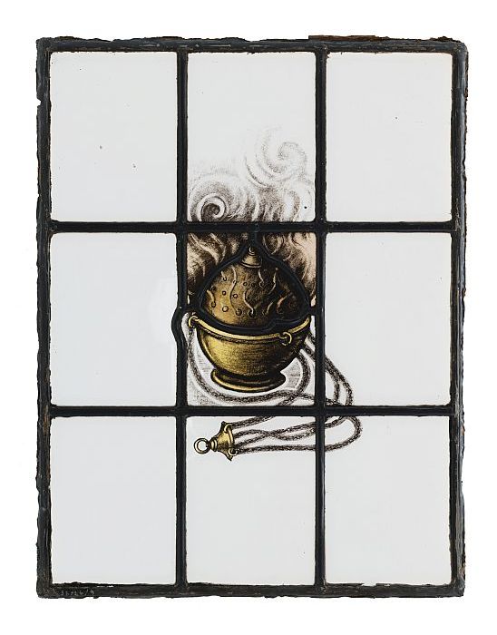 Deel van glas-in-loodraam met afbeelding wierookvat