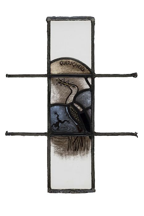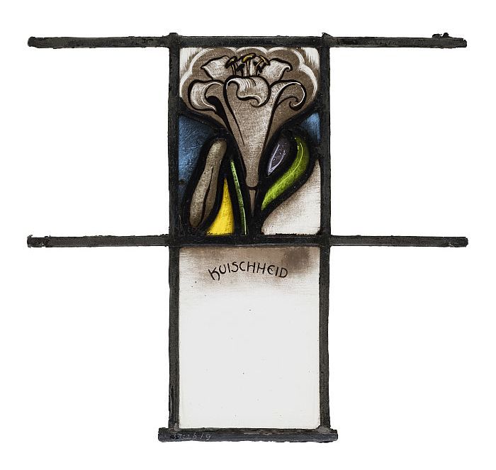Deel van glas-in-loodraam met afbeelding van een lel...
