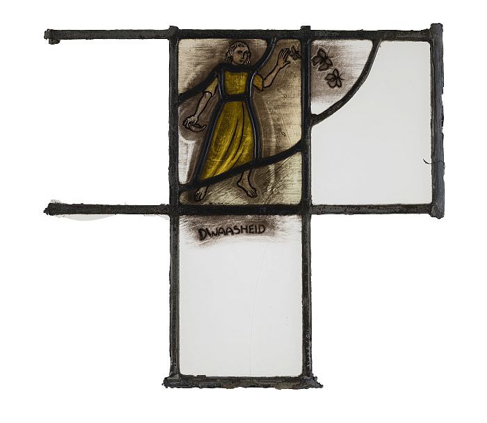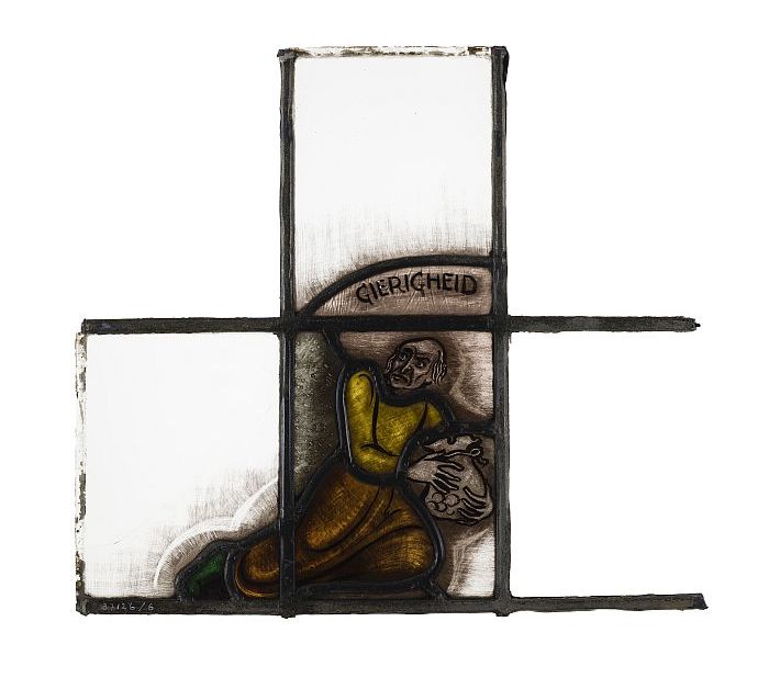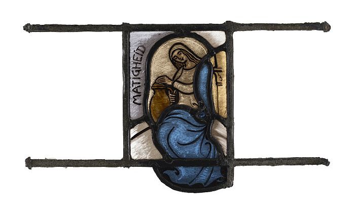 Deel van glas-in-loodraam met afbeelding van een mei...