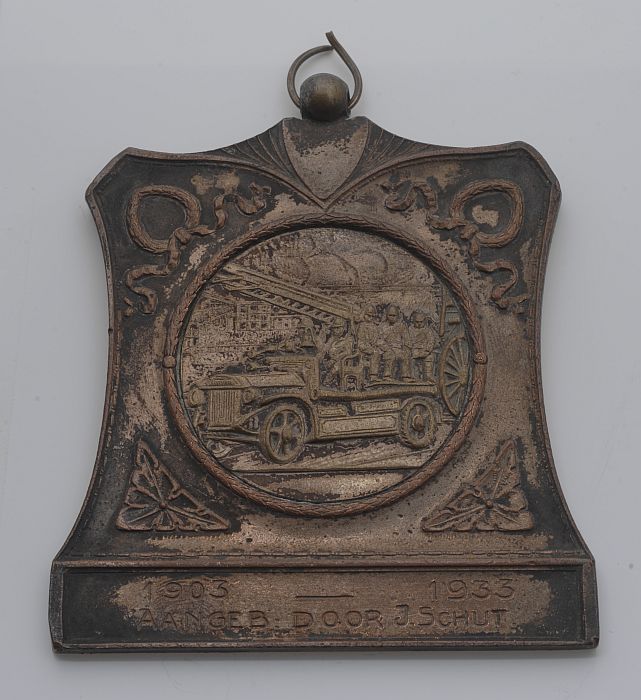 Plaquette met brandweerwagen en "1903 - 1933 / AANGE...