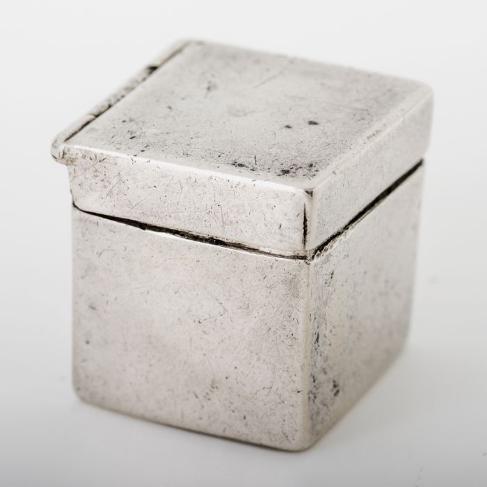 Vierkant zilveren doosje met deksel, daarin zwart te...