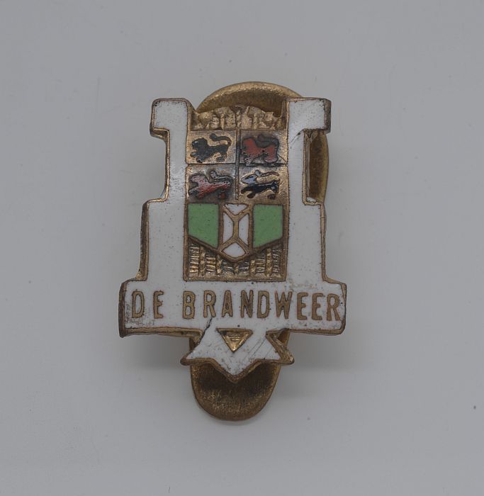 Veiligheidsspeld met op wit lint een brandweerinsign...
