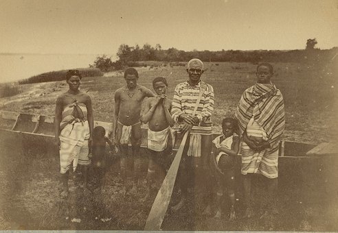Marrons met korjaal en peddel bij rivier, Suriname (...