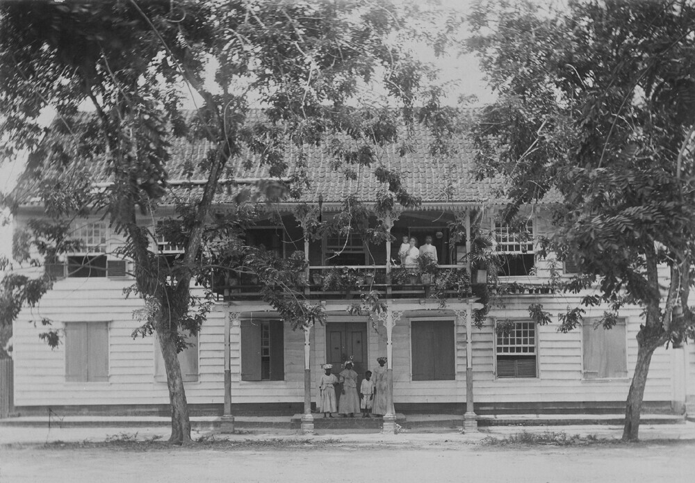 Familie Bolten poserend met personeel op het balkon ...