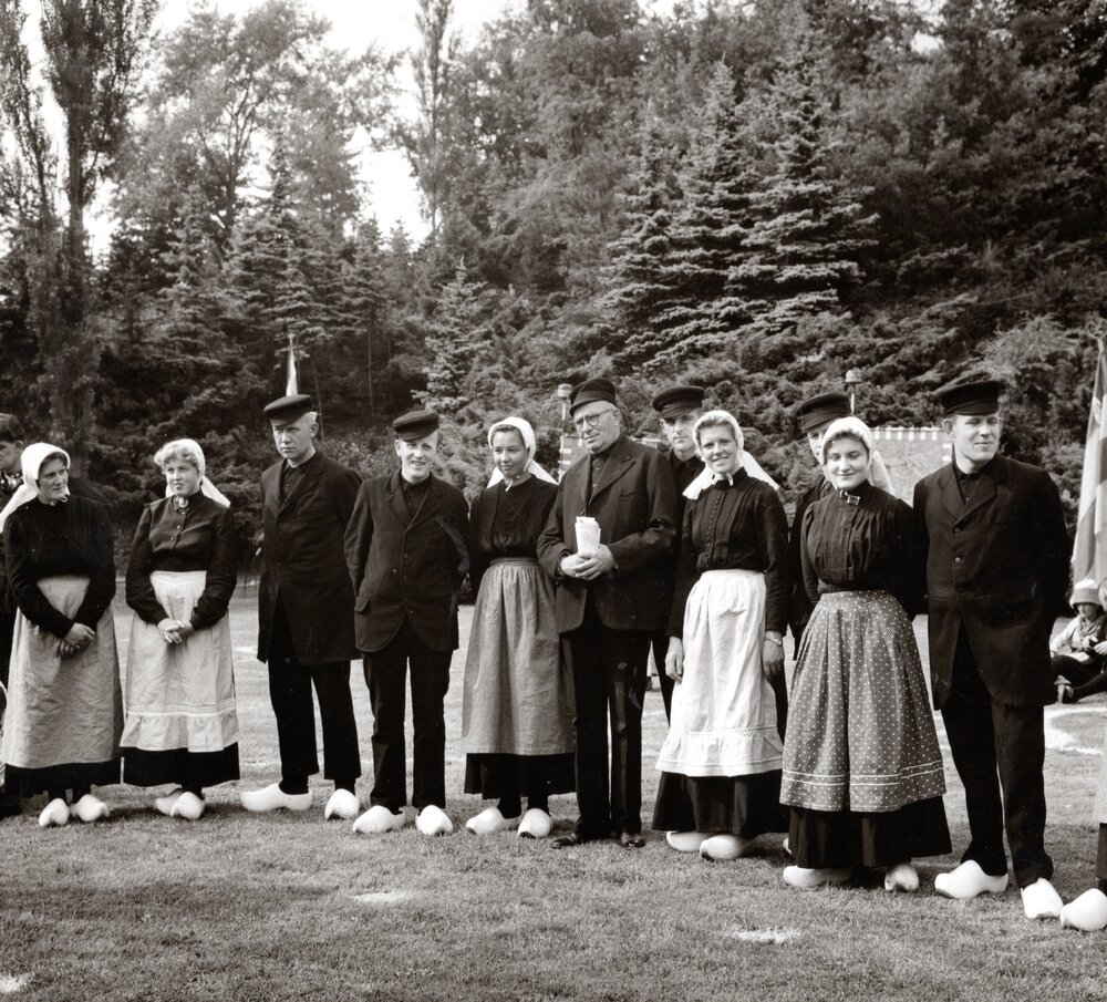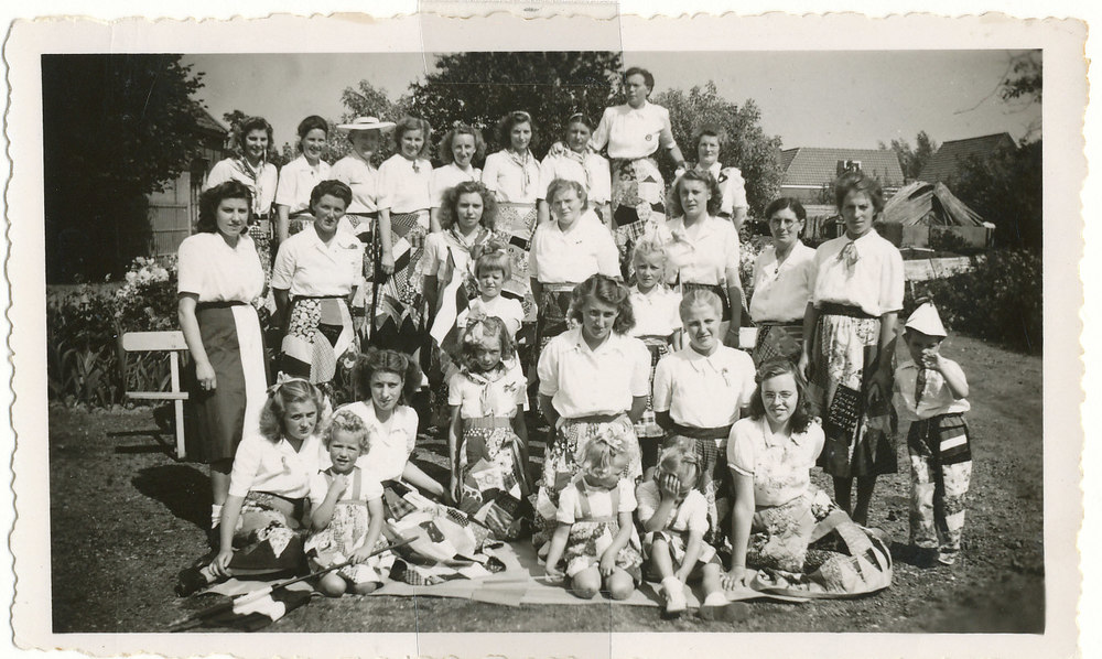 Een groep mannen en vrouwen in klederdracht