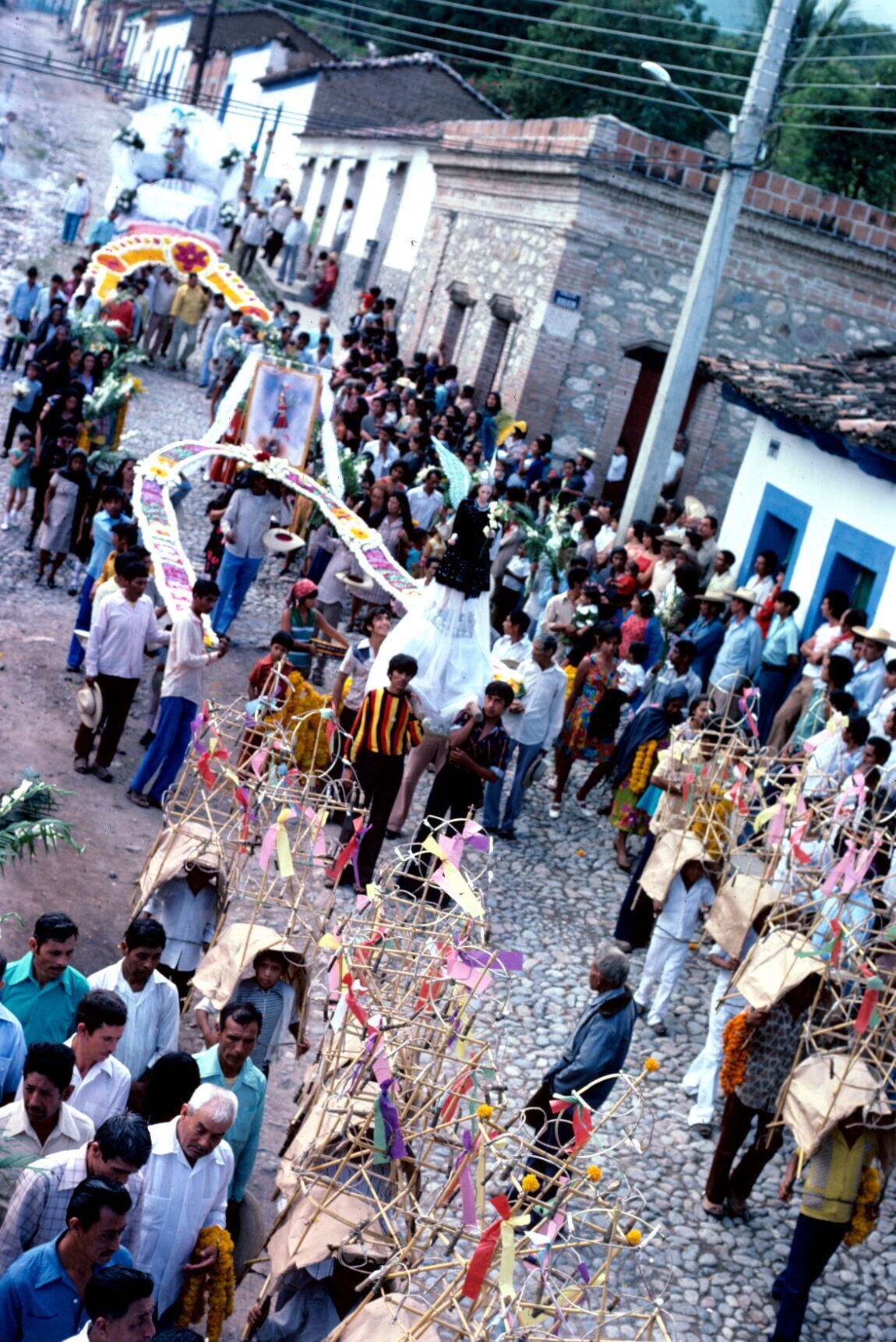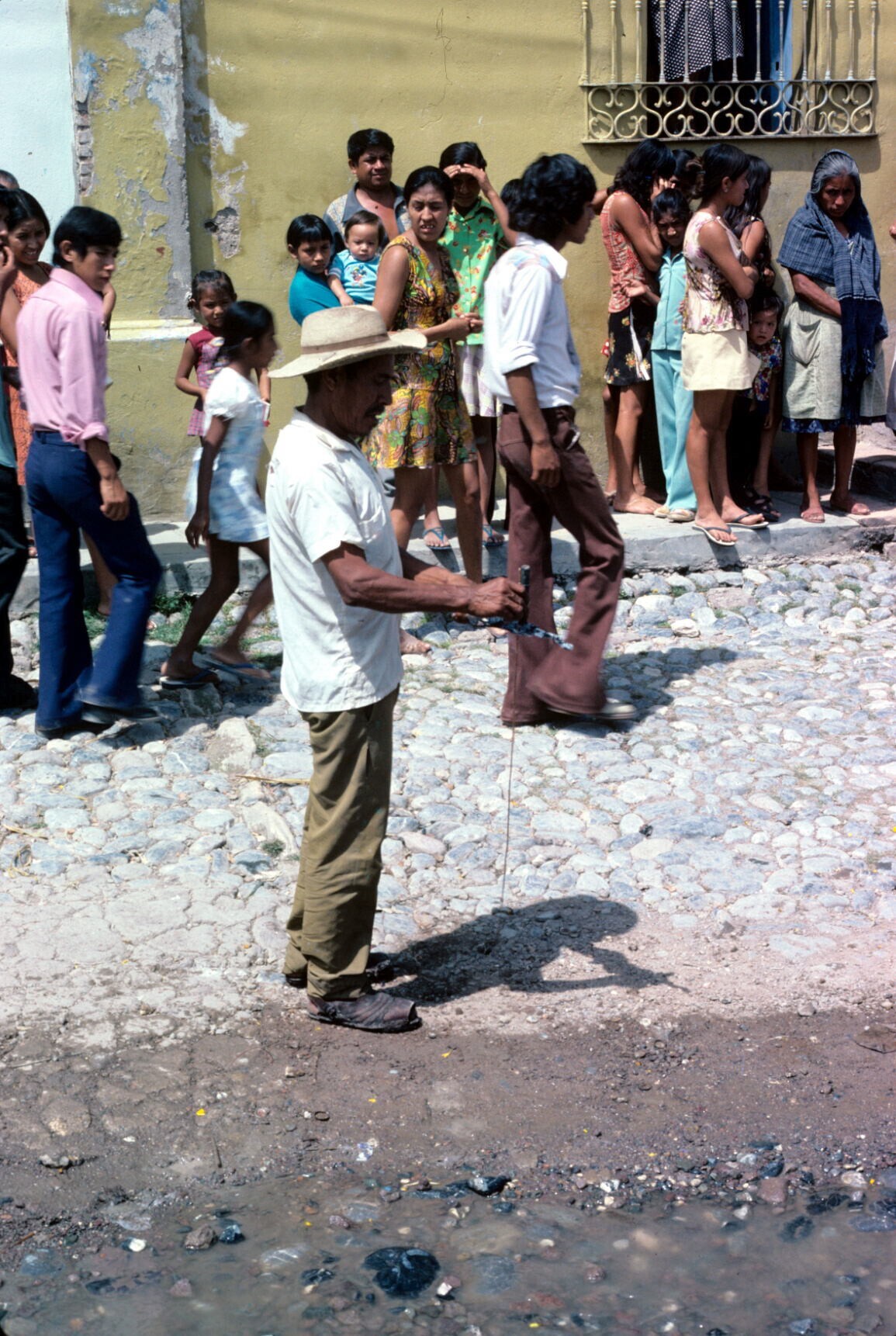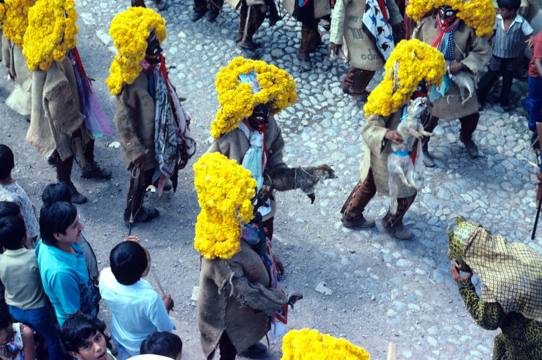dansers in dans van de Tlacololeros; NB slangenstaven