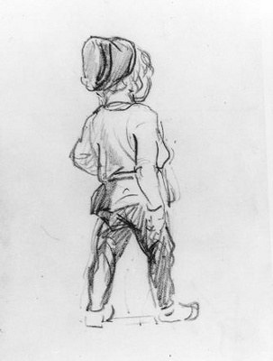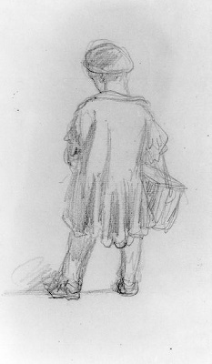 Jongen met poetsgereedschap op de rug gezien, in Ams...