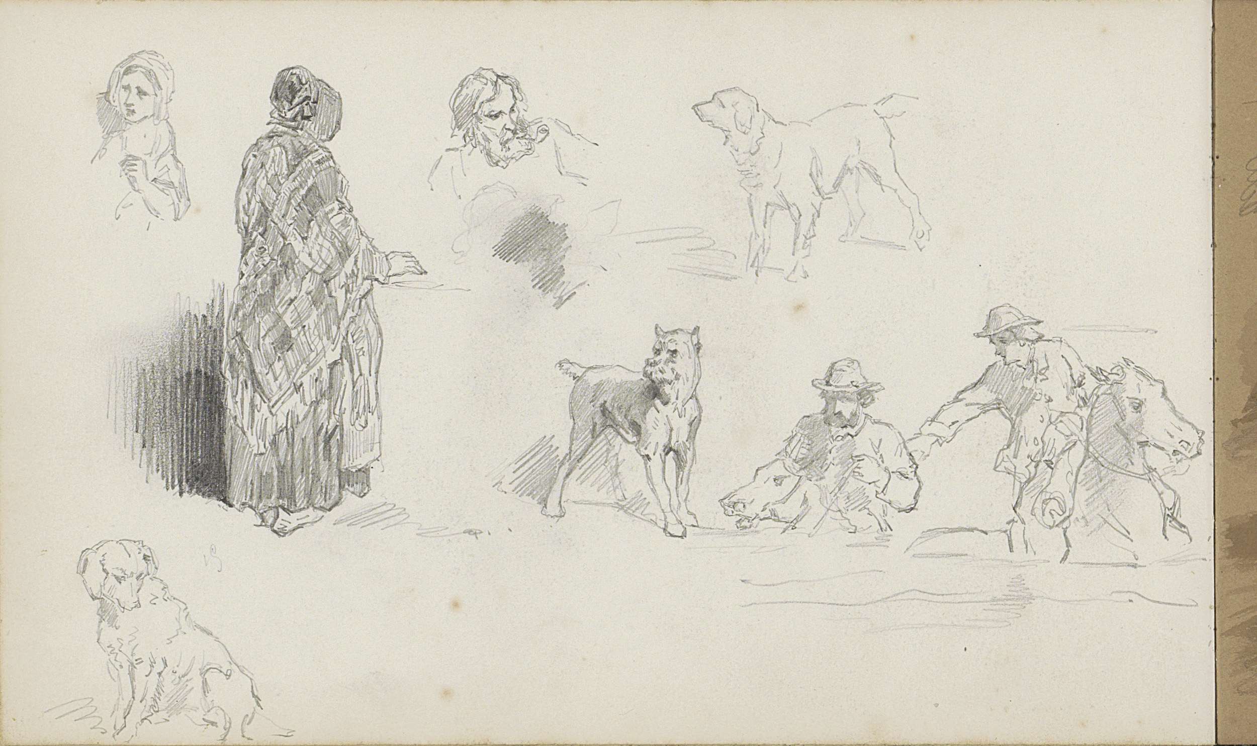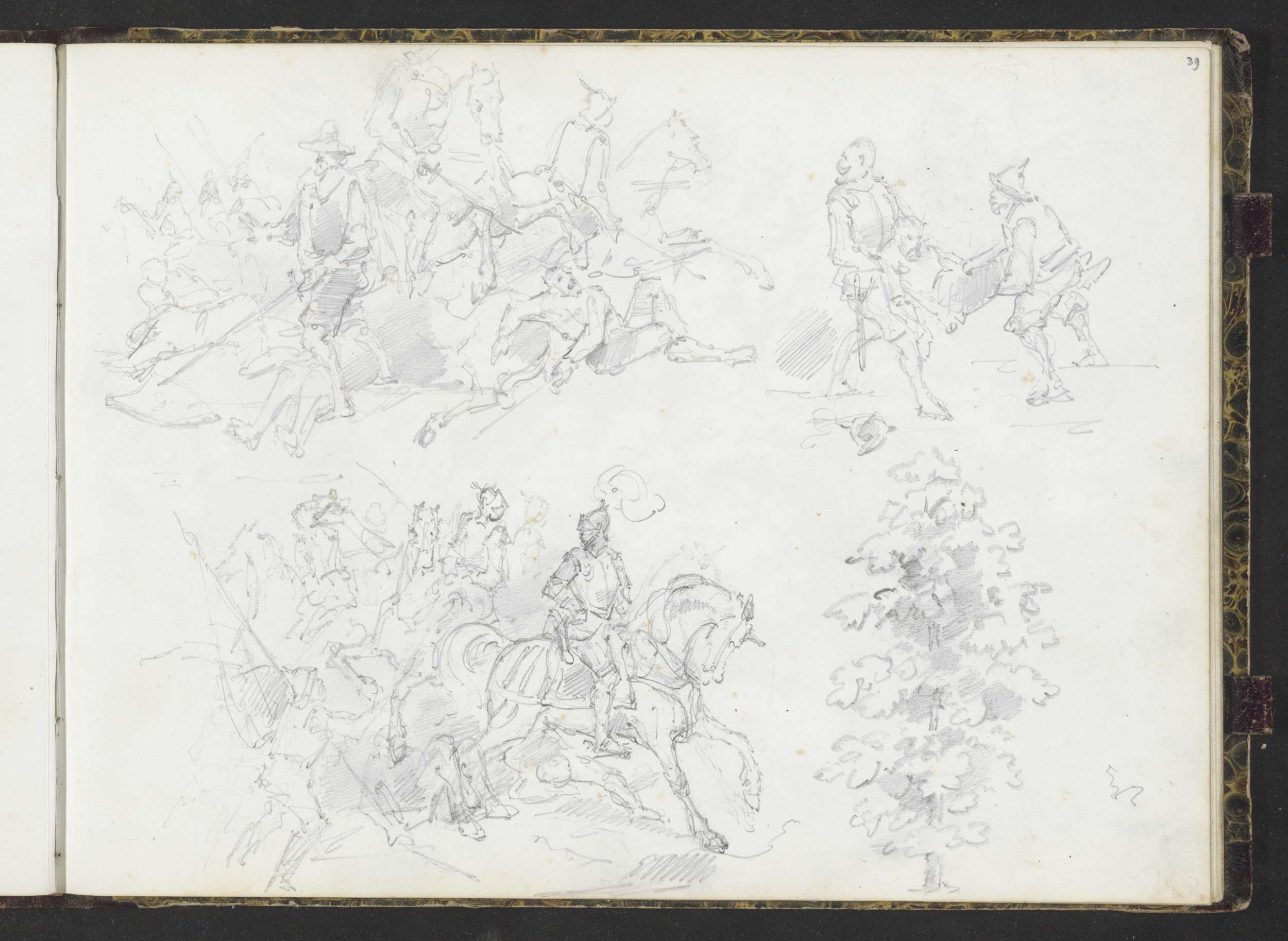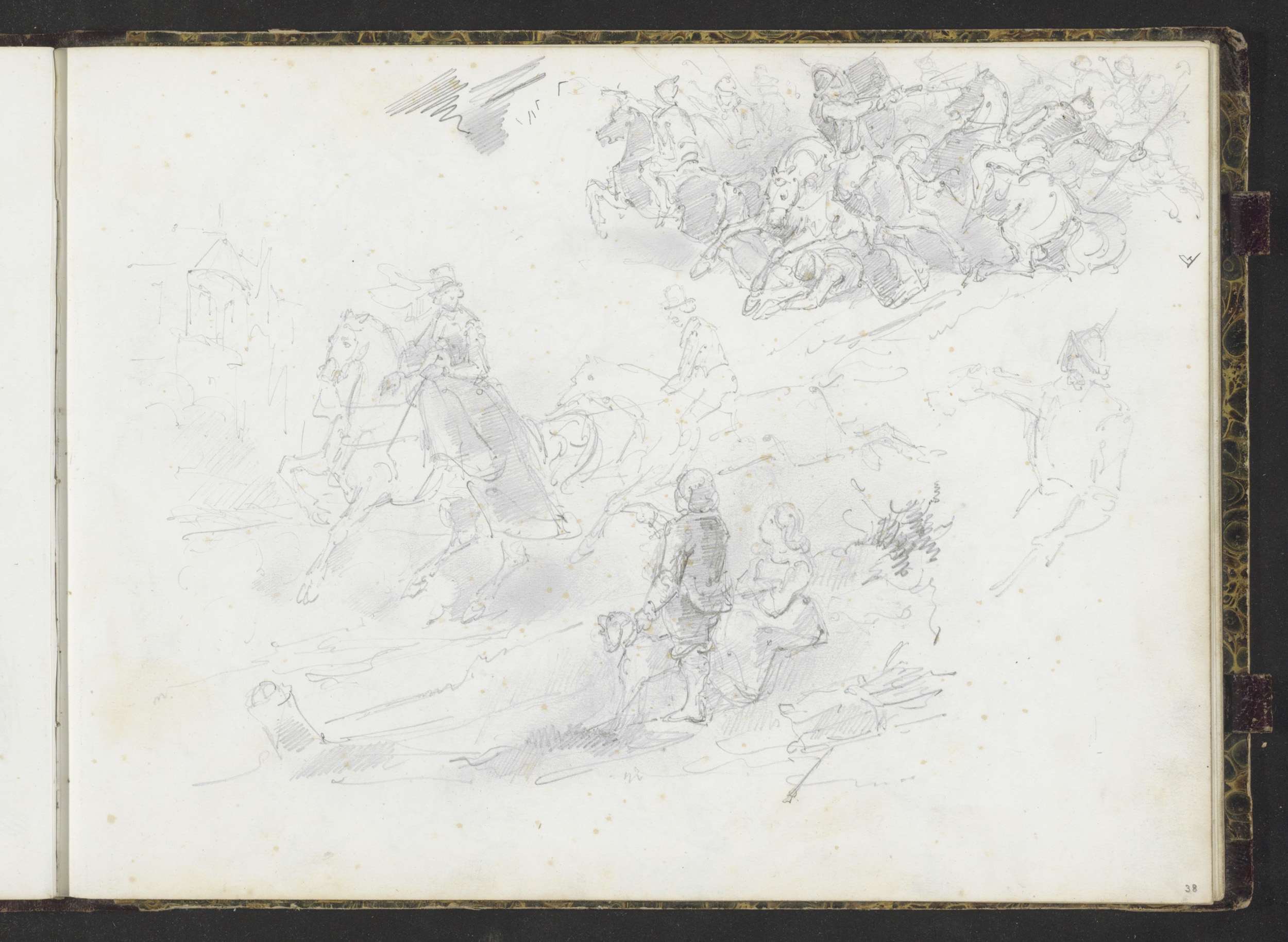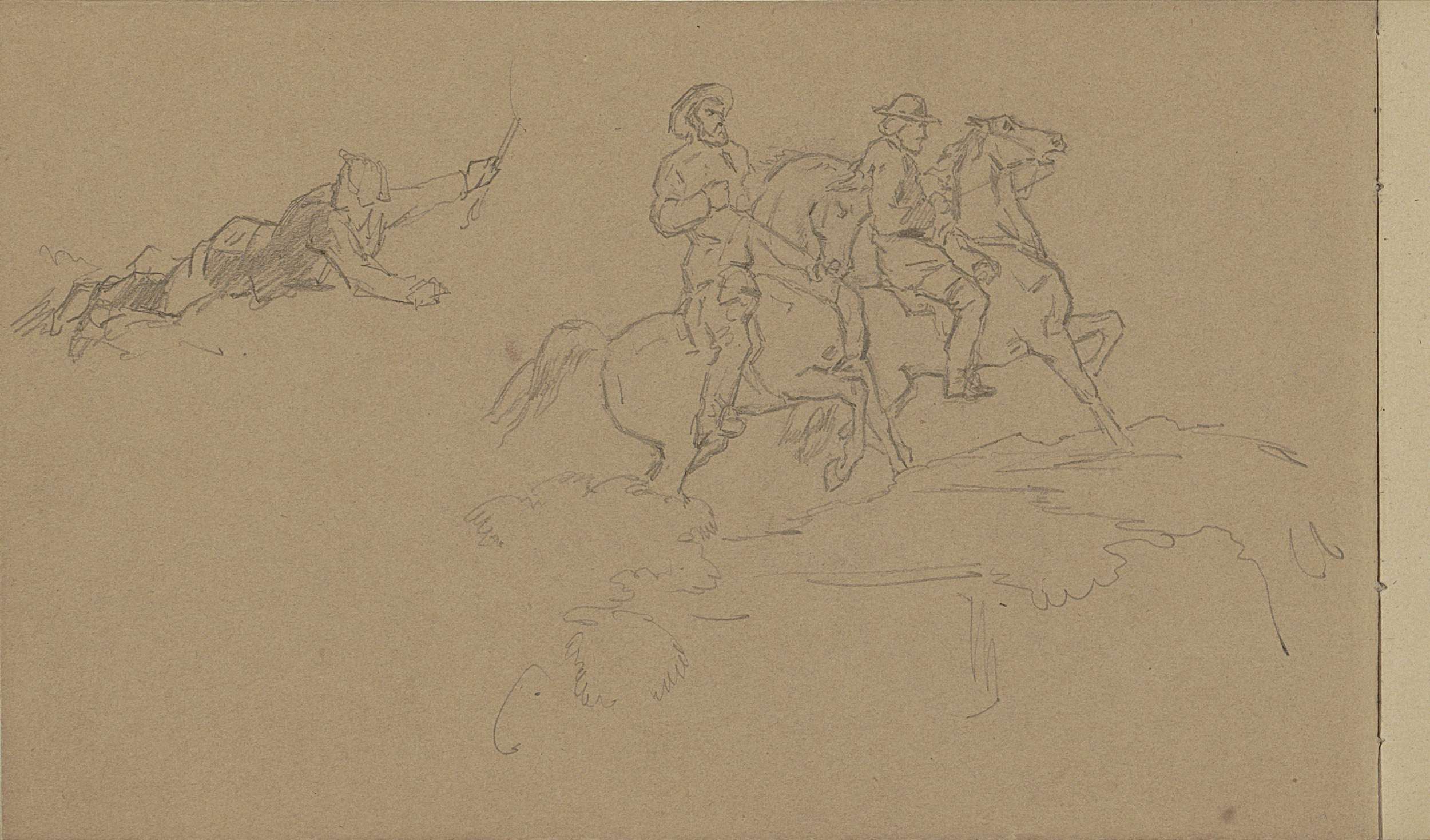 Studieblad met ruitergevechten, vissers, koppen en h...