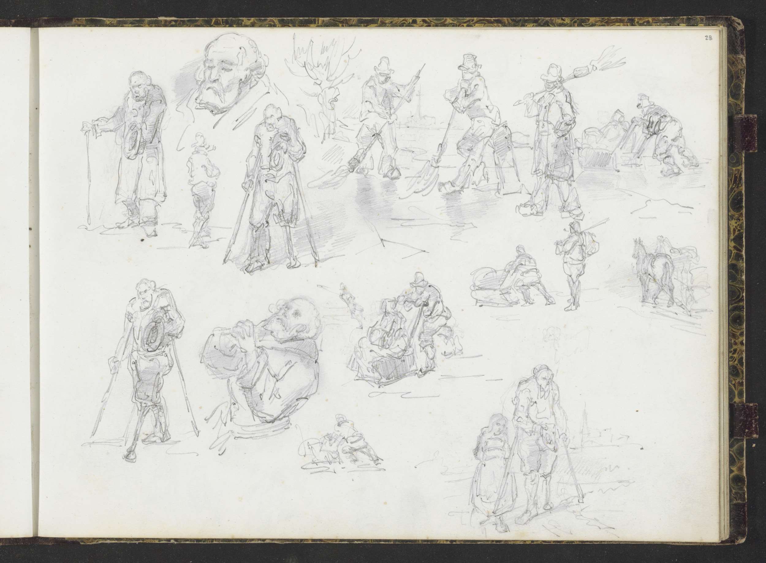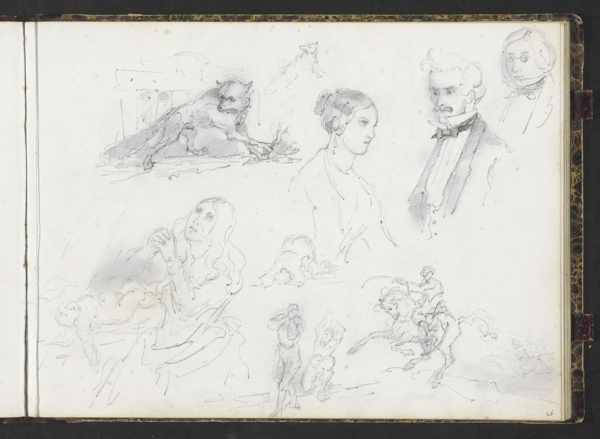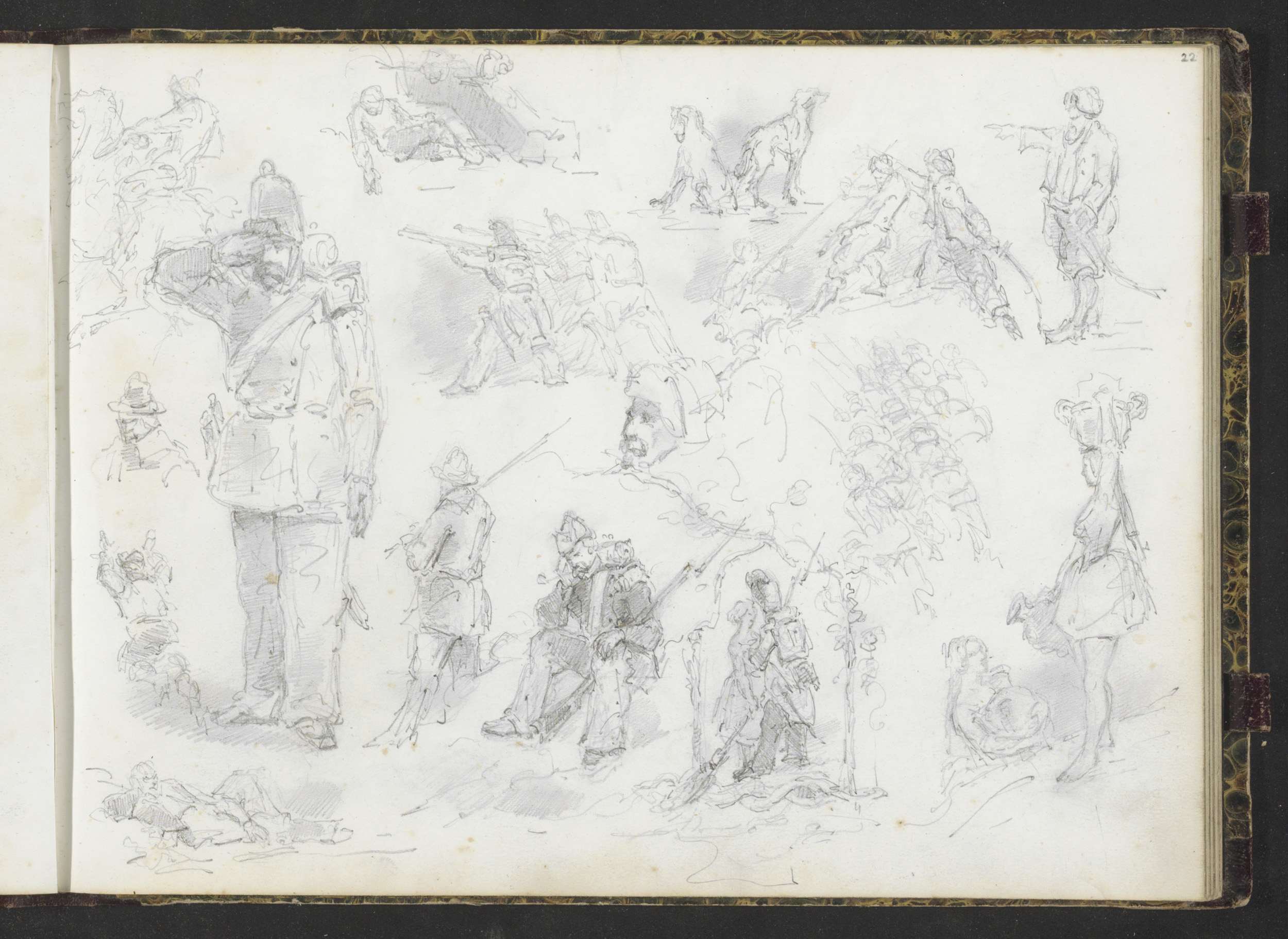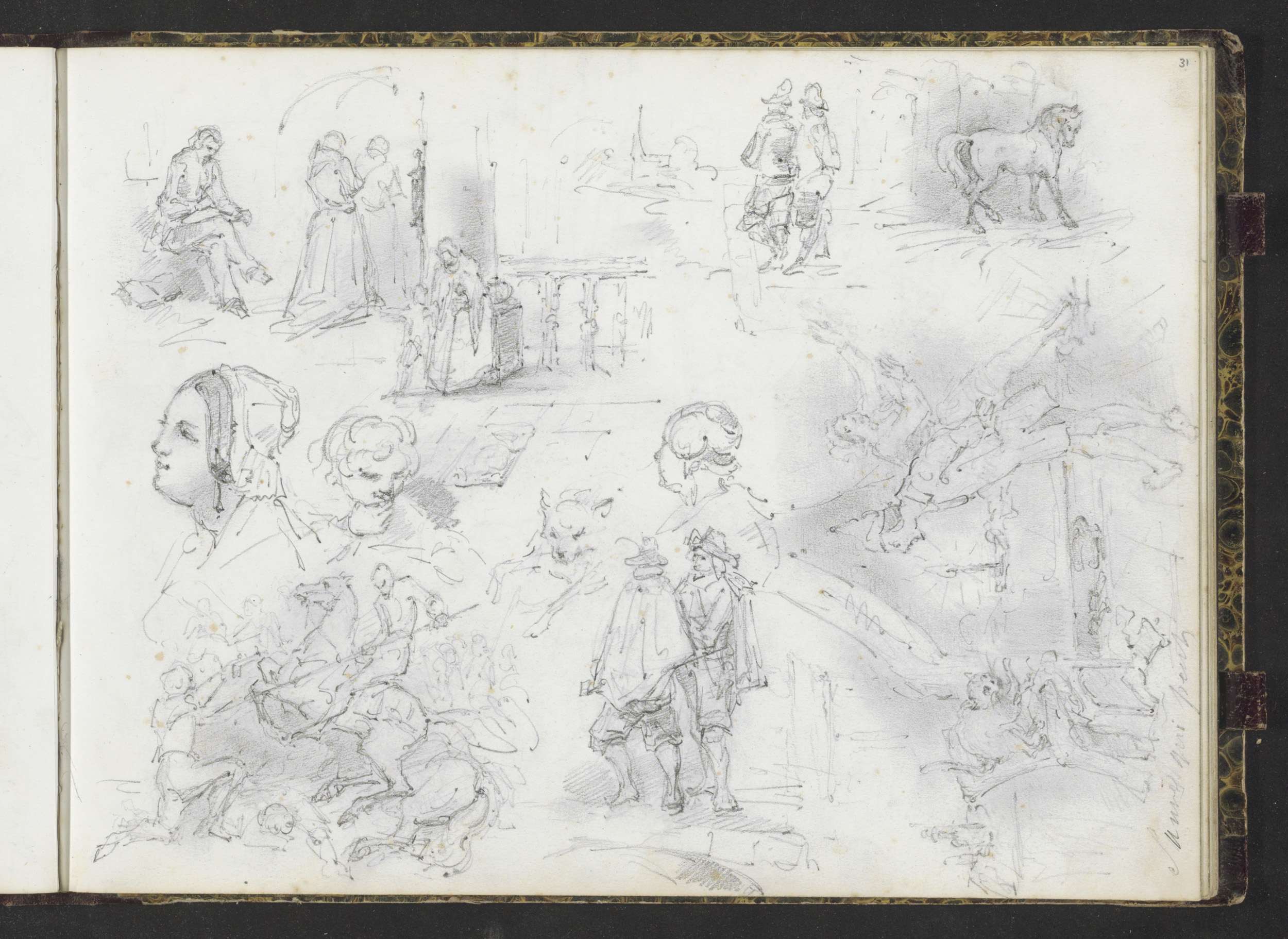 Studieblad met ruitergevechten, vissers, koppen en h...