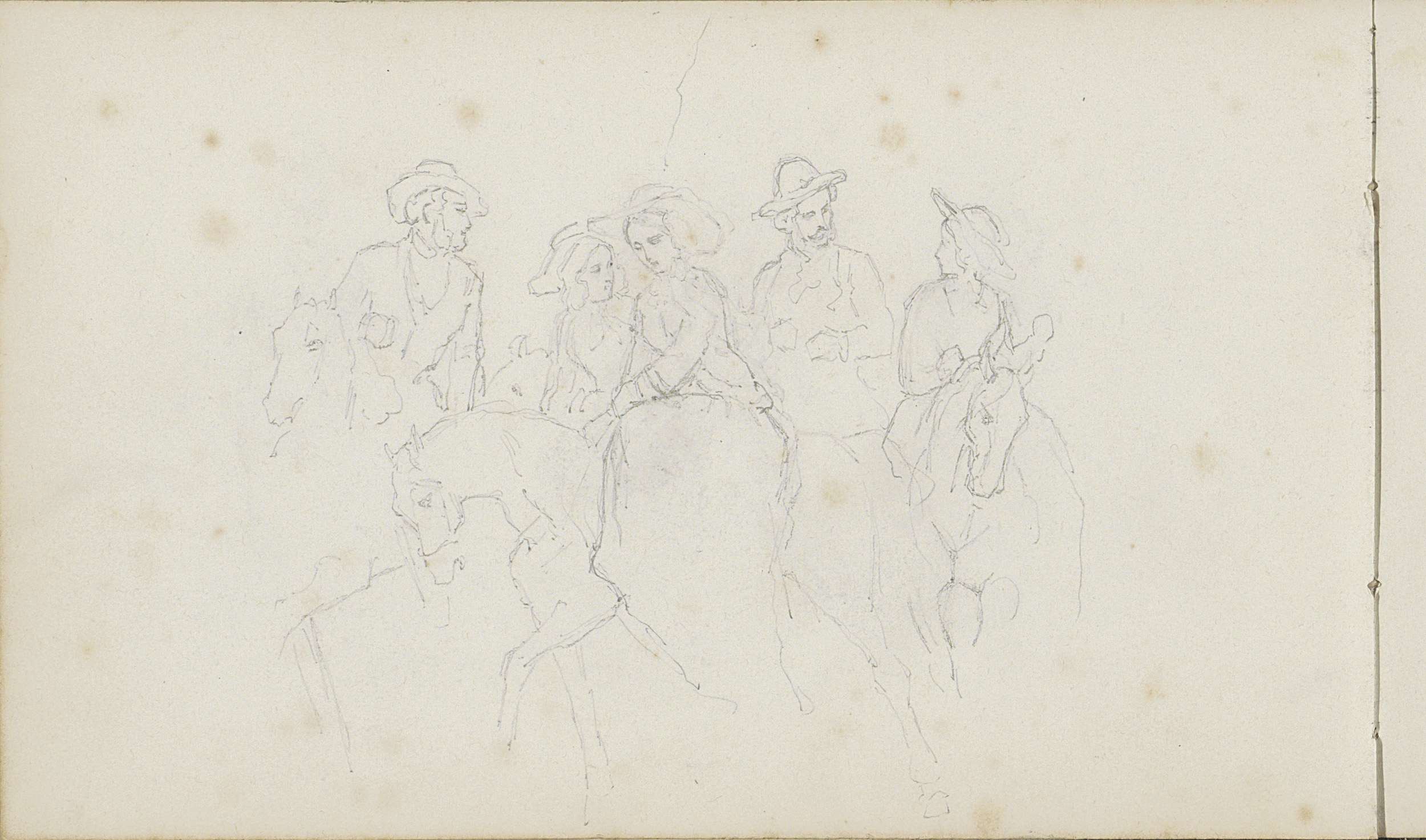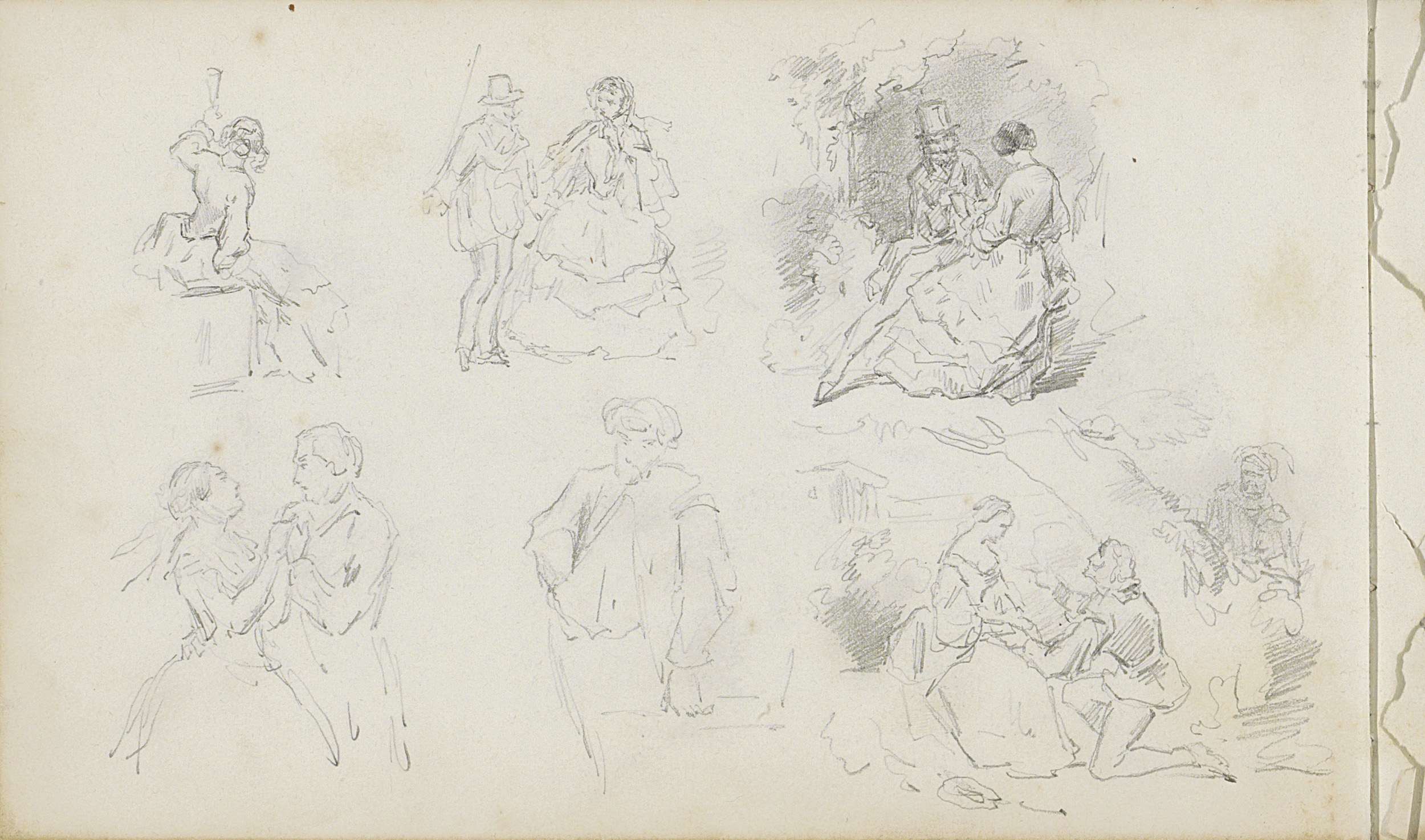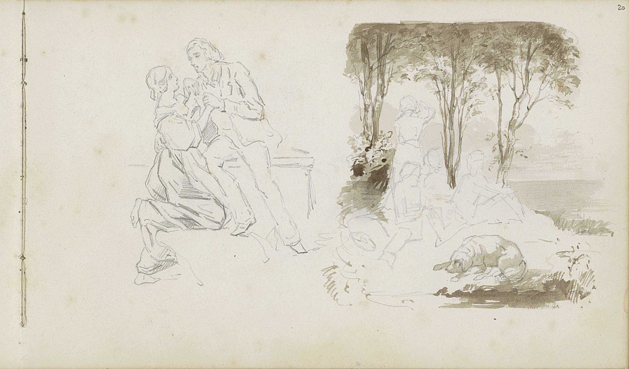 Studieblad met een liefdespaar, nonnen en een ruiter...