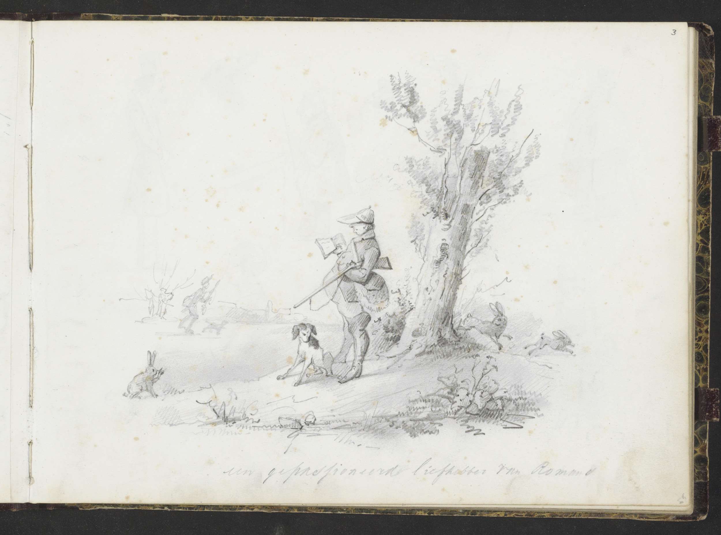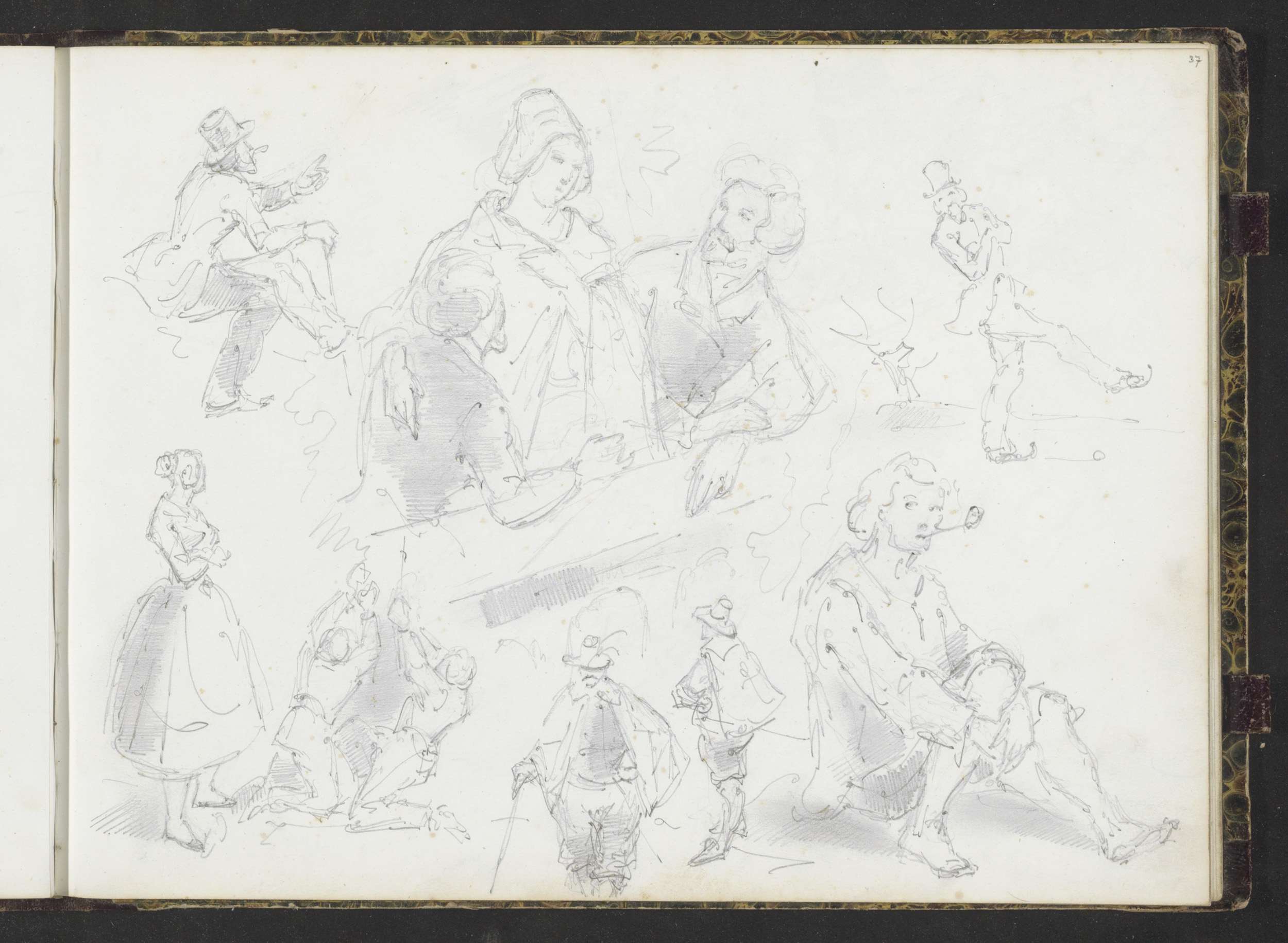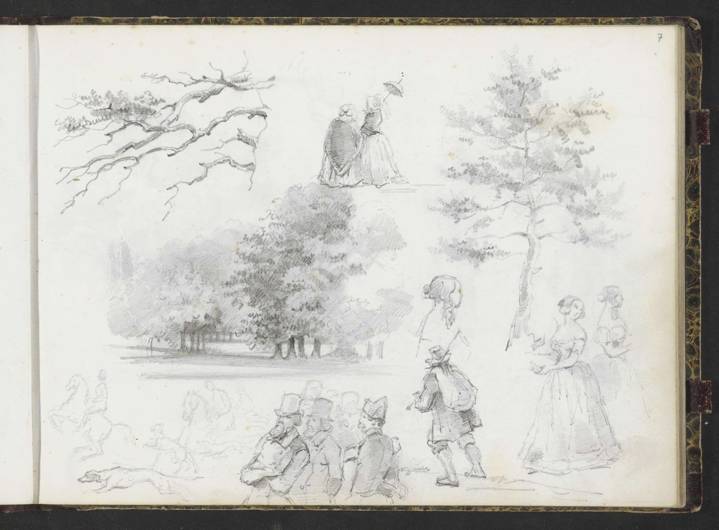 Studieblad met een liefdespaar, nonnen en een ruiter...