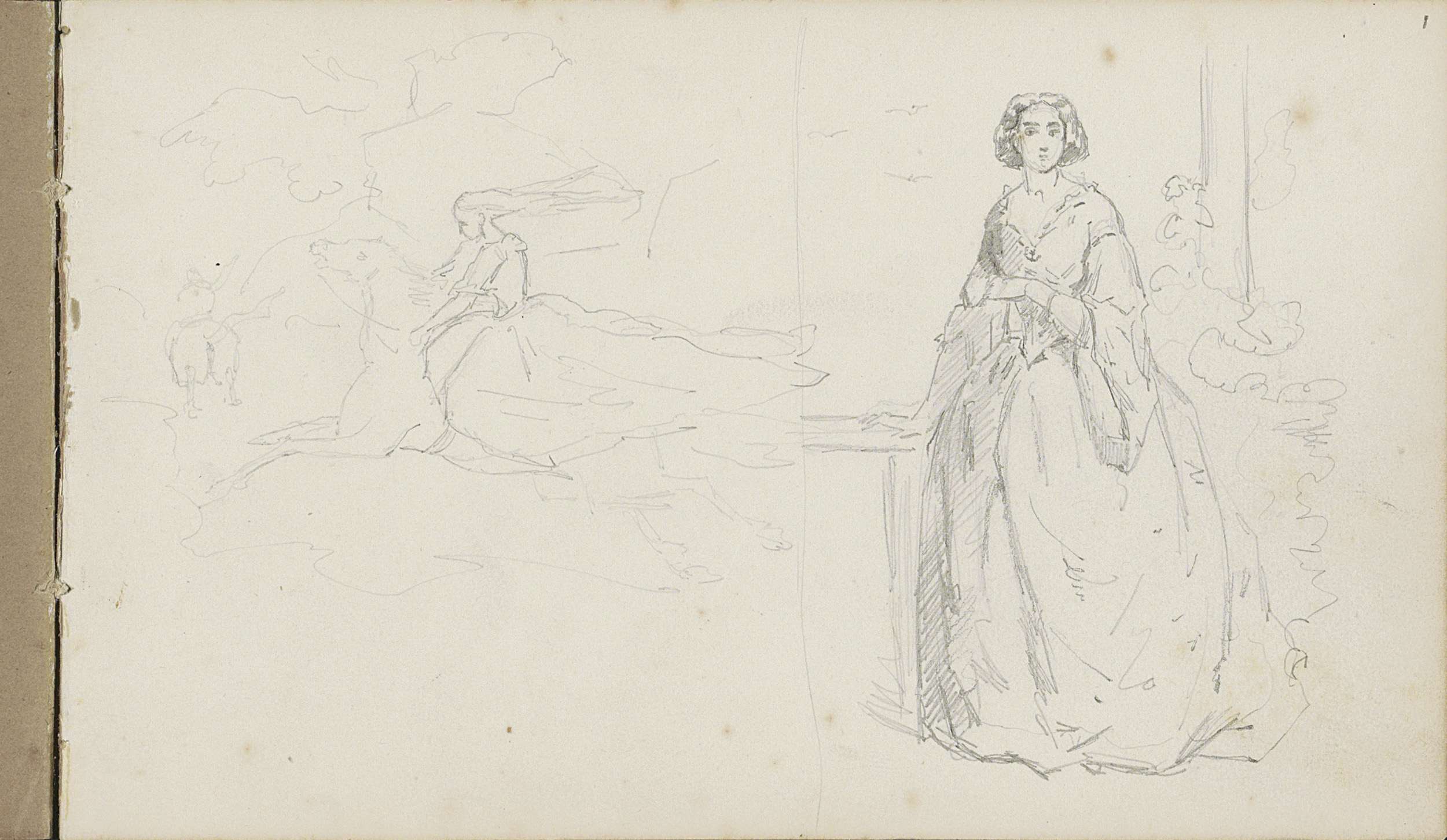 Studieblad met een ruiter, vrouwelijk naakt en valle...