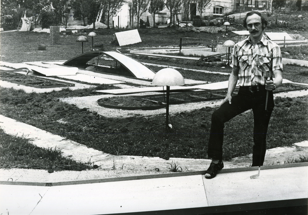 Zwart-wit foto van de heer Mulder op de mini golfbaa...