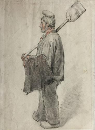 Staande boer met schop over zijn schouder