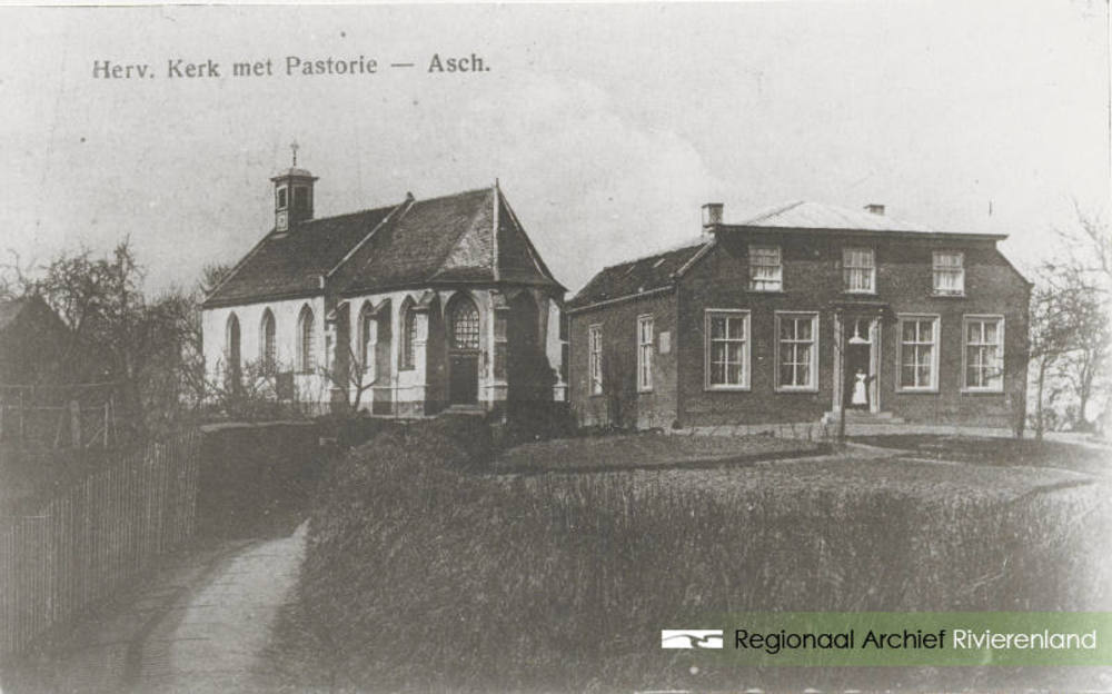 N.H.-kerk met pastorie, repro van ansichtkaart.