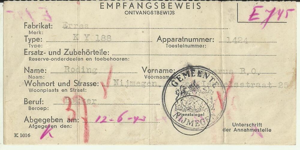 Ontvangstbewijs op naam van Roding. 12 juni 1943.