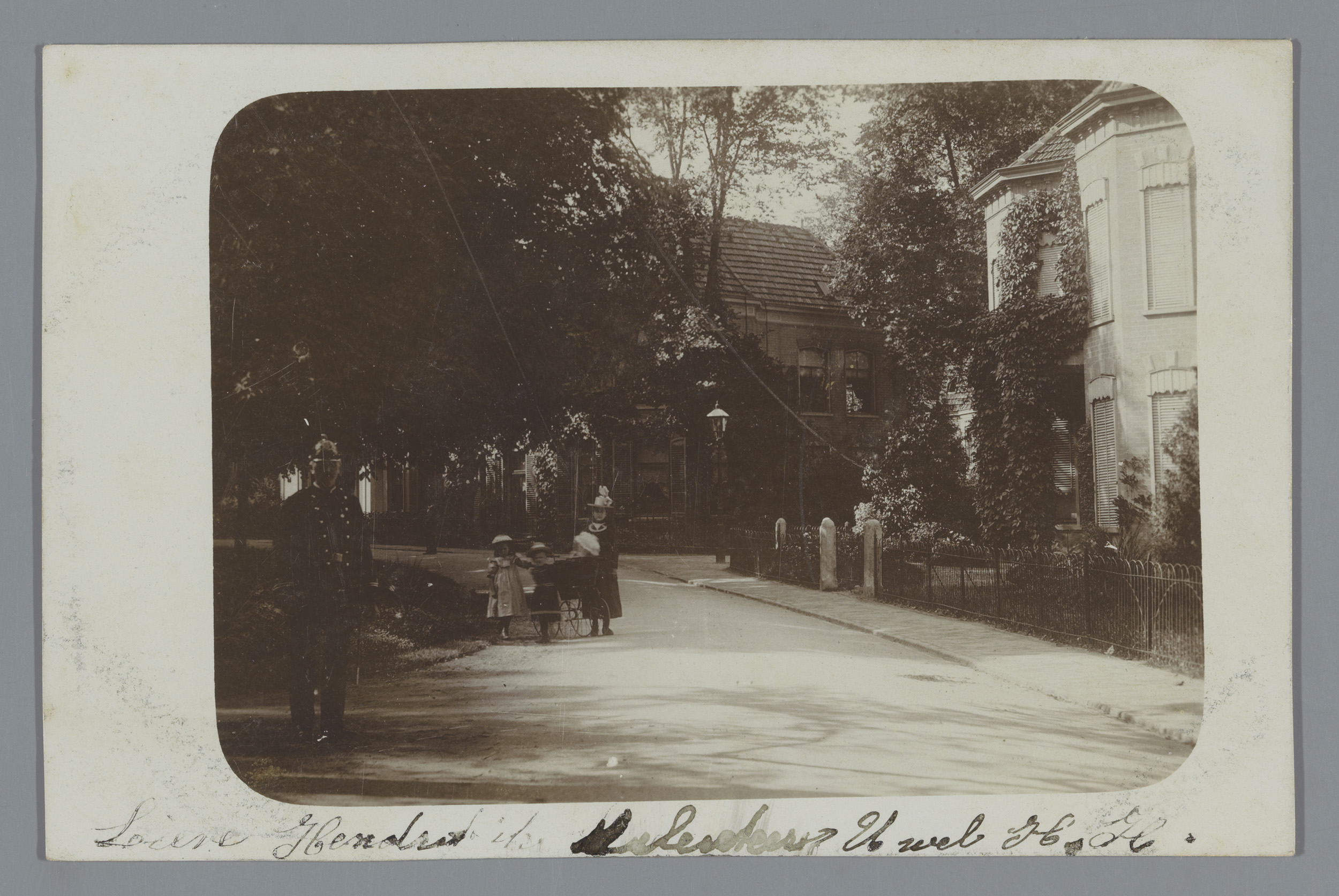Gezicht op een straat met een man in uniform en een ...