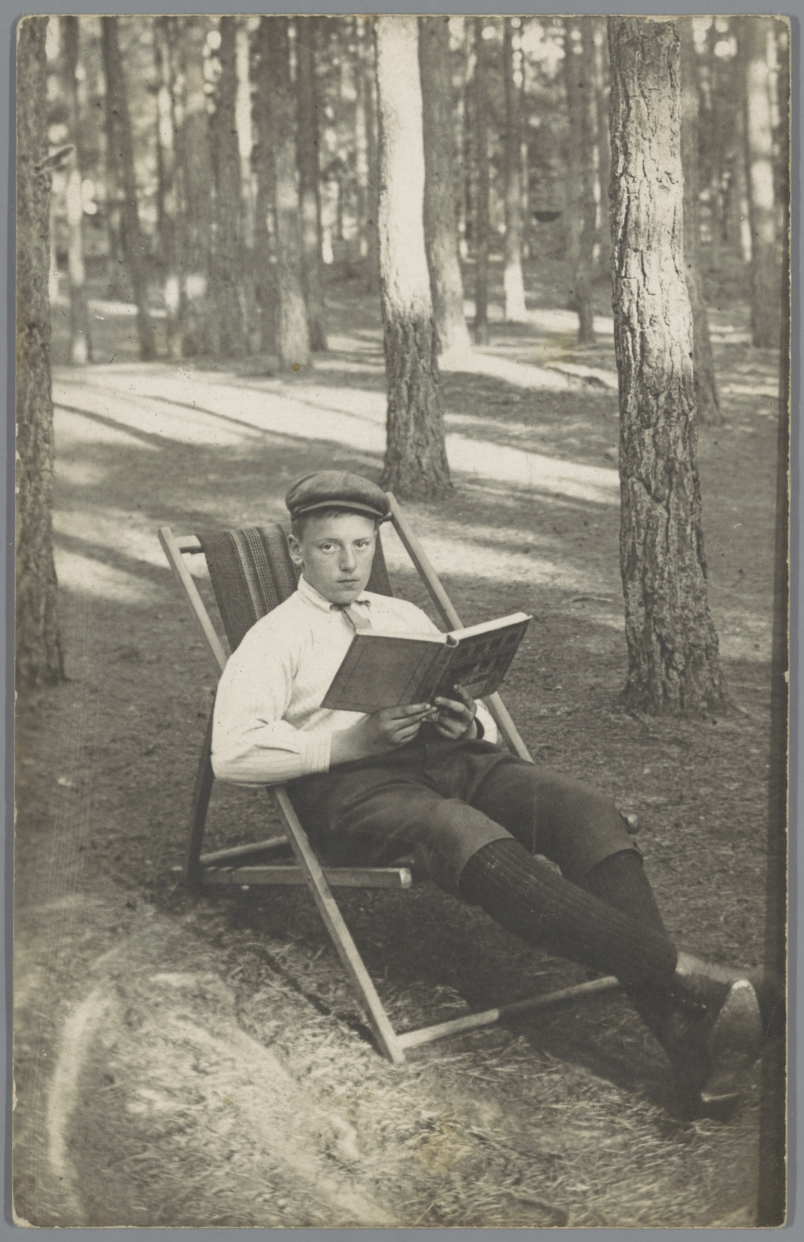 Portret van een onbekende jongen op een strandstoel ...