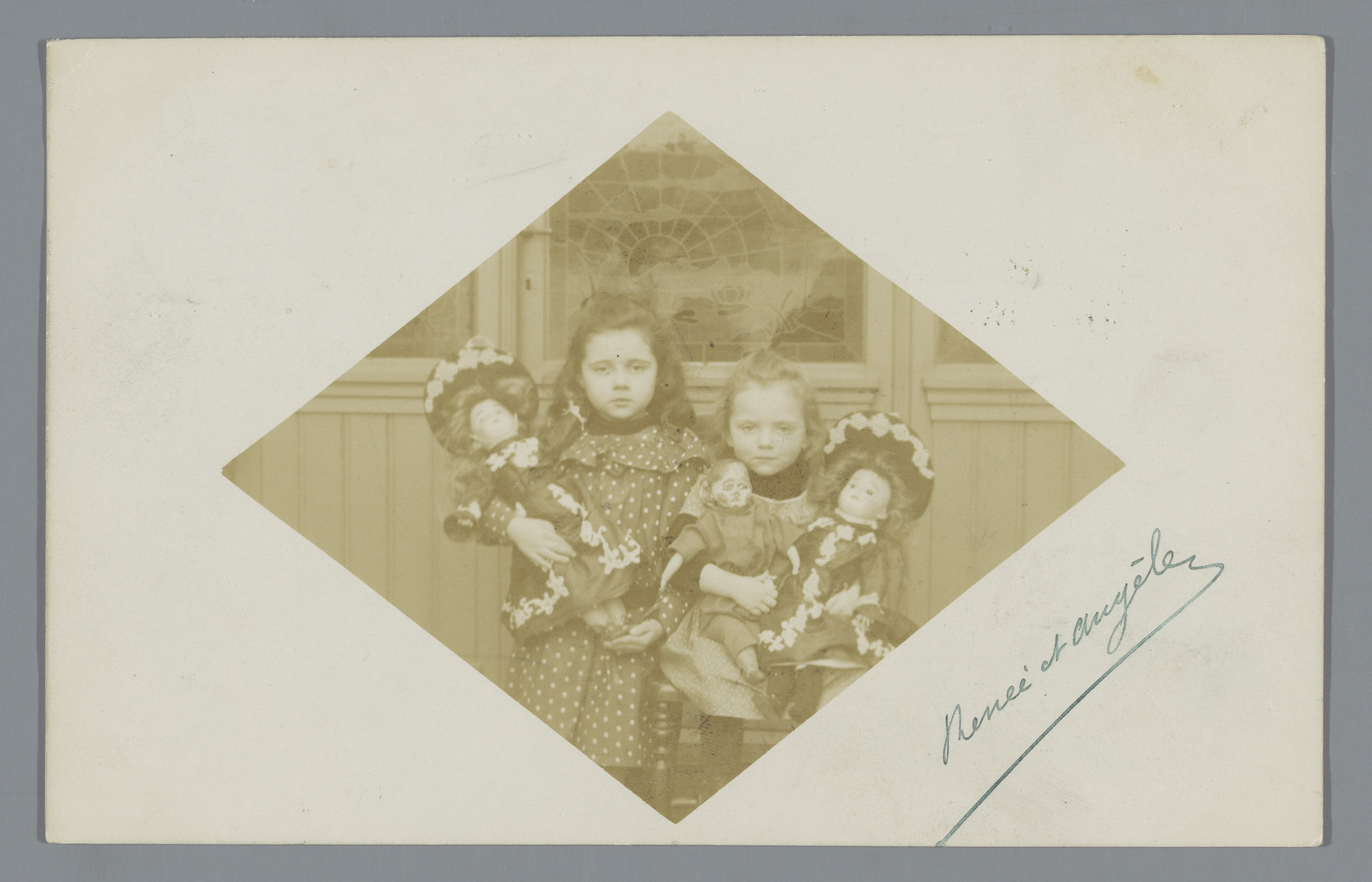Kinderportret van Renée en Angèle met poppen
