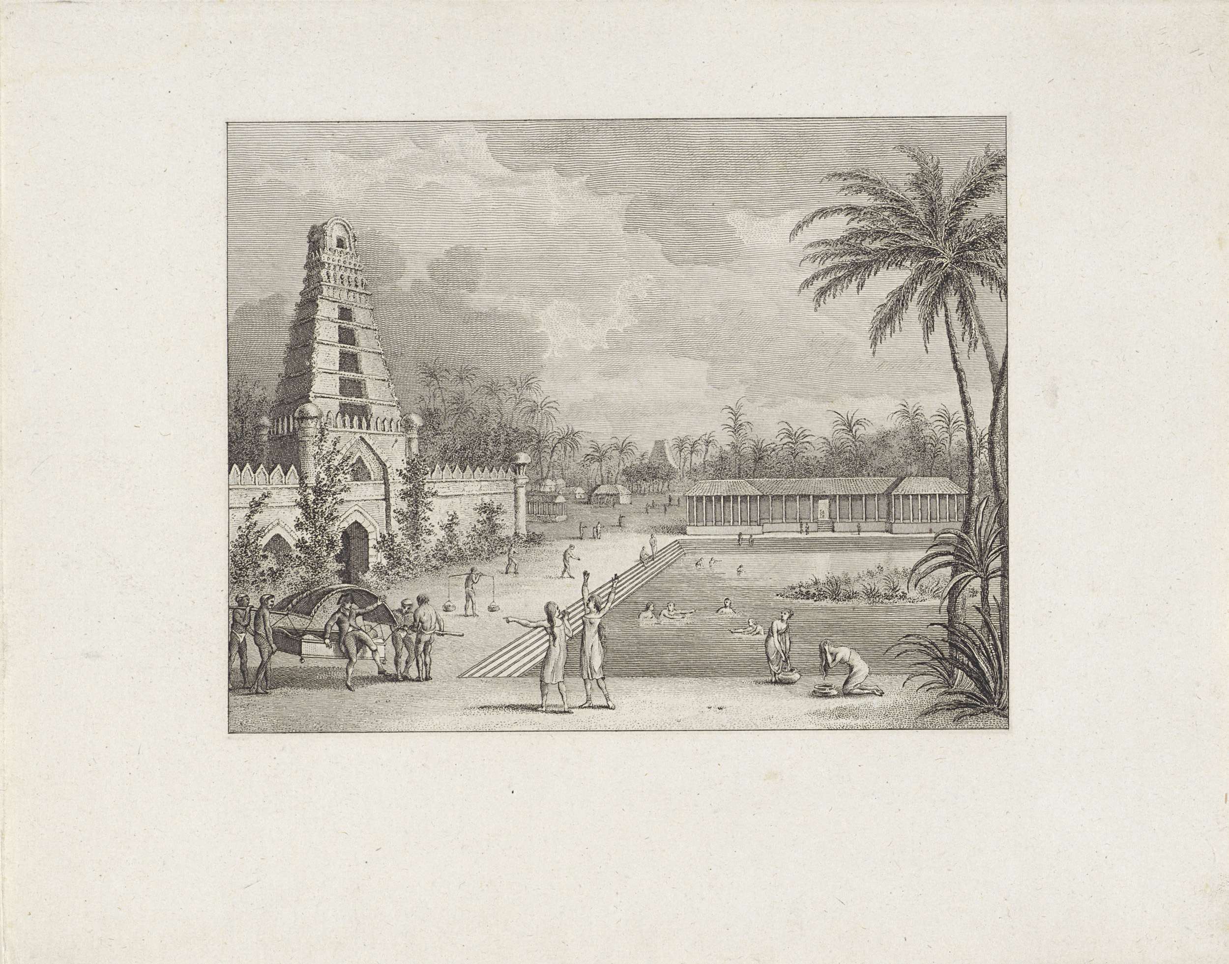 Baders in een vijver bij een tempel