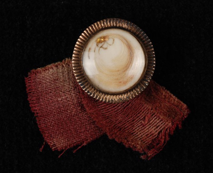 Rond speldje met stukje haar achter glas, op rood st...