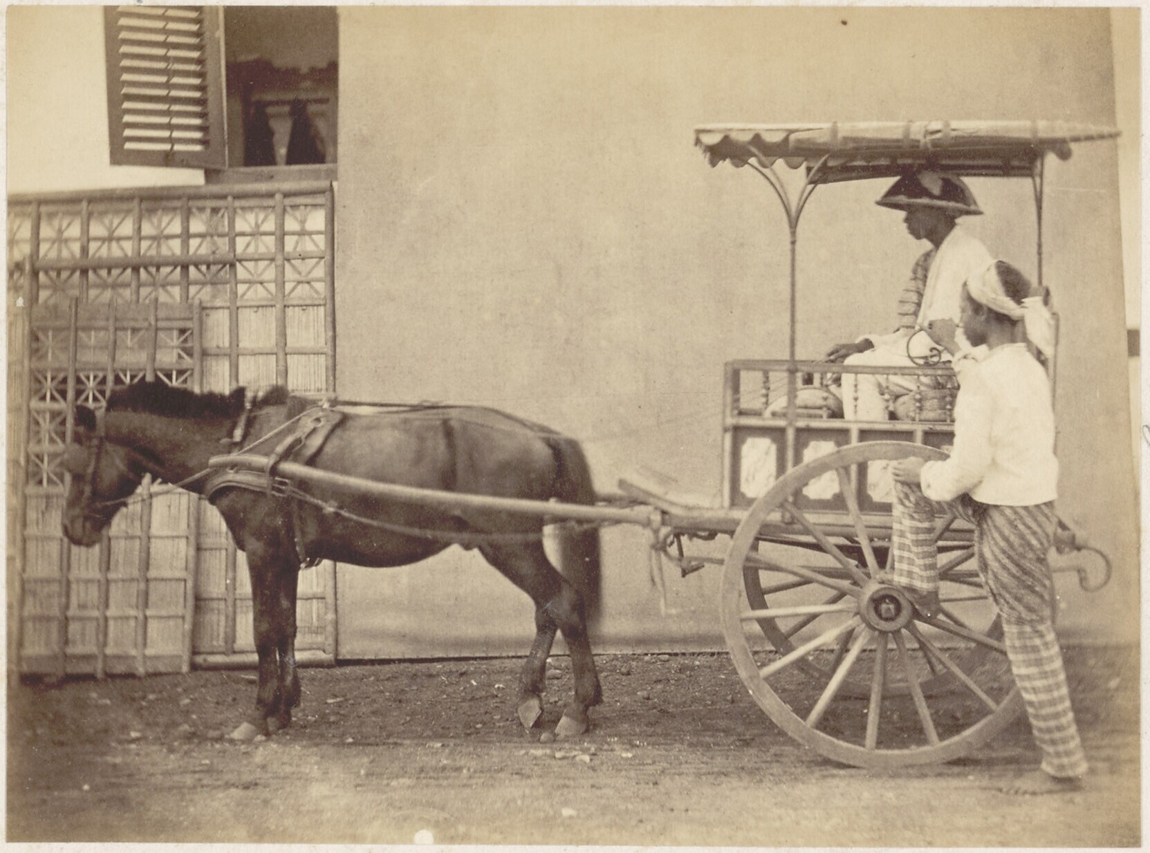 Een door een paard voortgetrokken rijtuig, met op de...