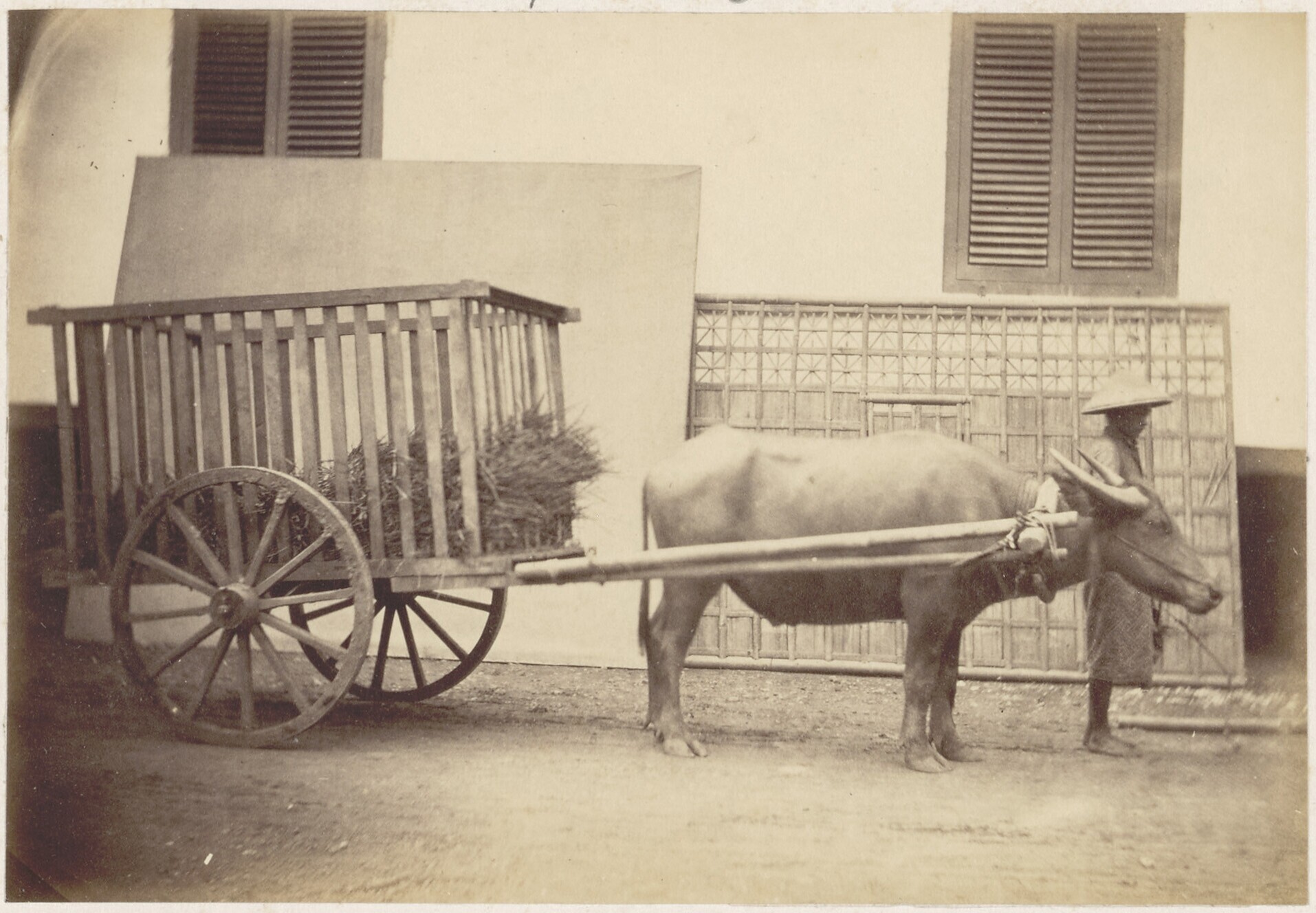 Een door een os voortgetrokken en met gras geladen k...
