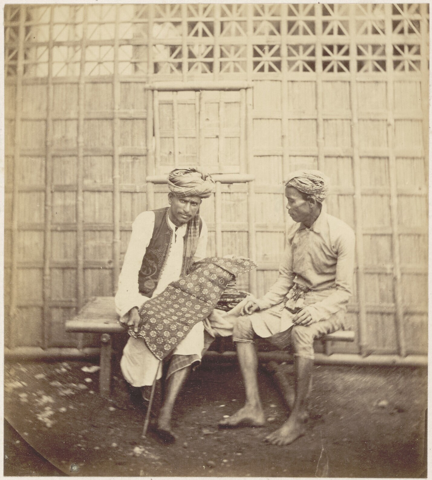 Studioportret van een verkoper van sarongs en een kl...