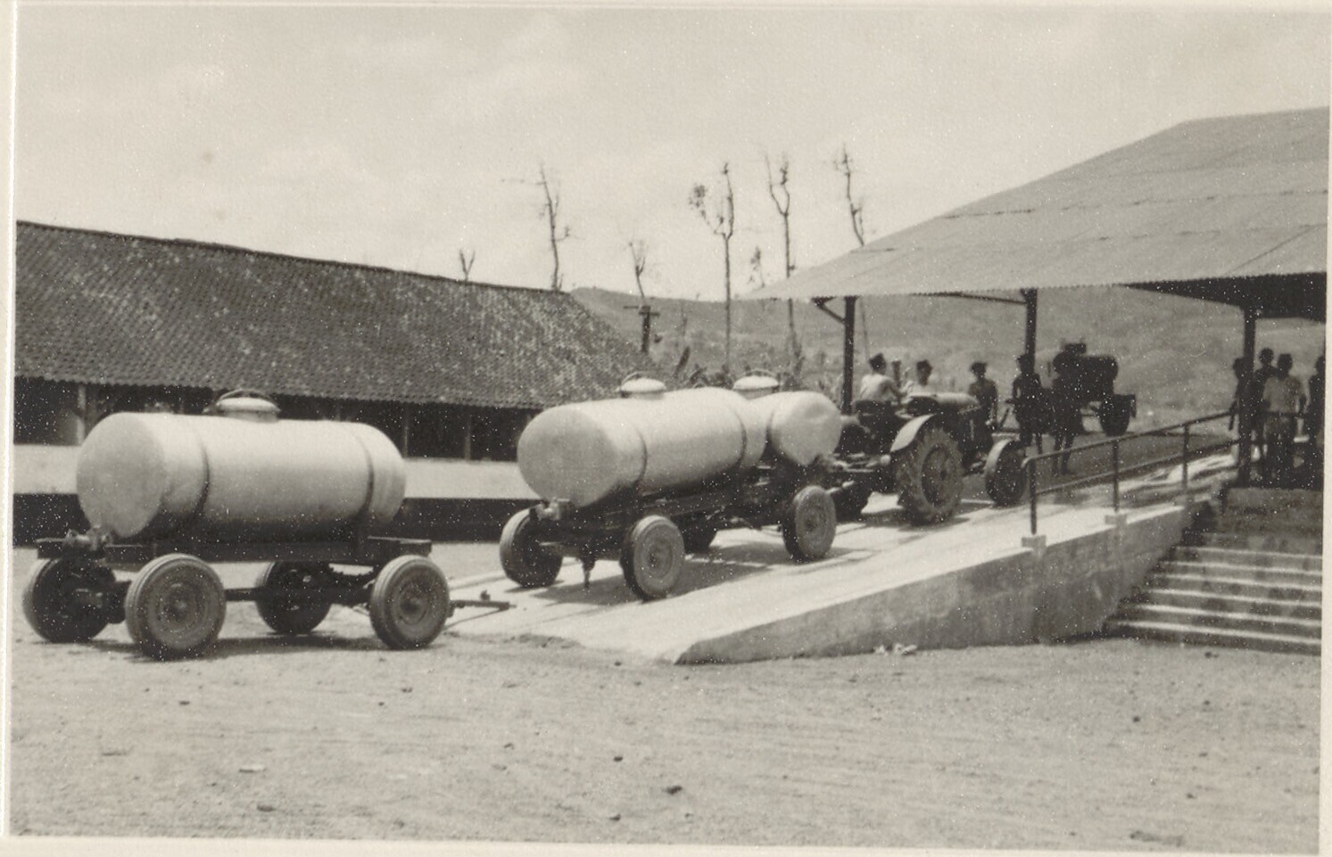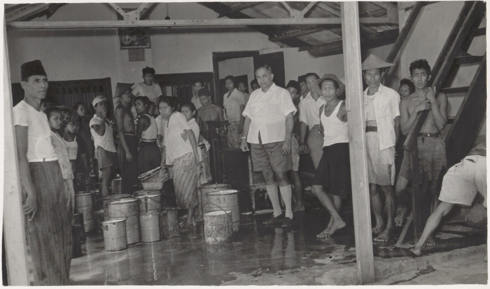 Rubbertappers met hun verzamelemmers en -vaten tijde...