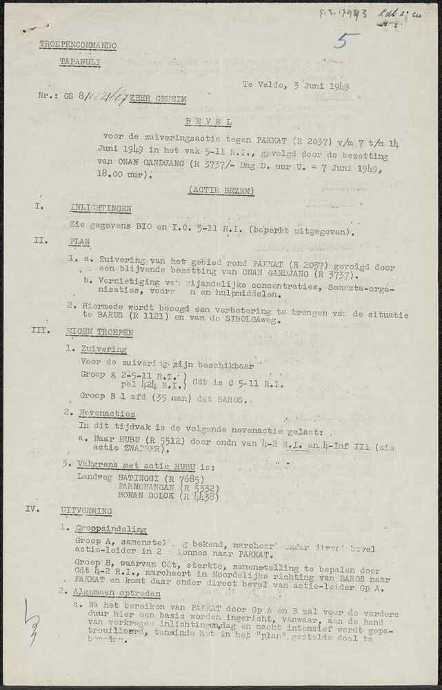 Brief van Troepencommando Tapanuli met Bevel voor de...