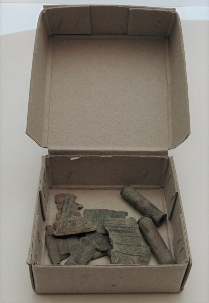 bodemvondst, doosje met scherven en enkele hulzen