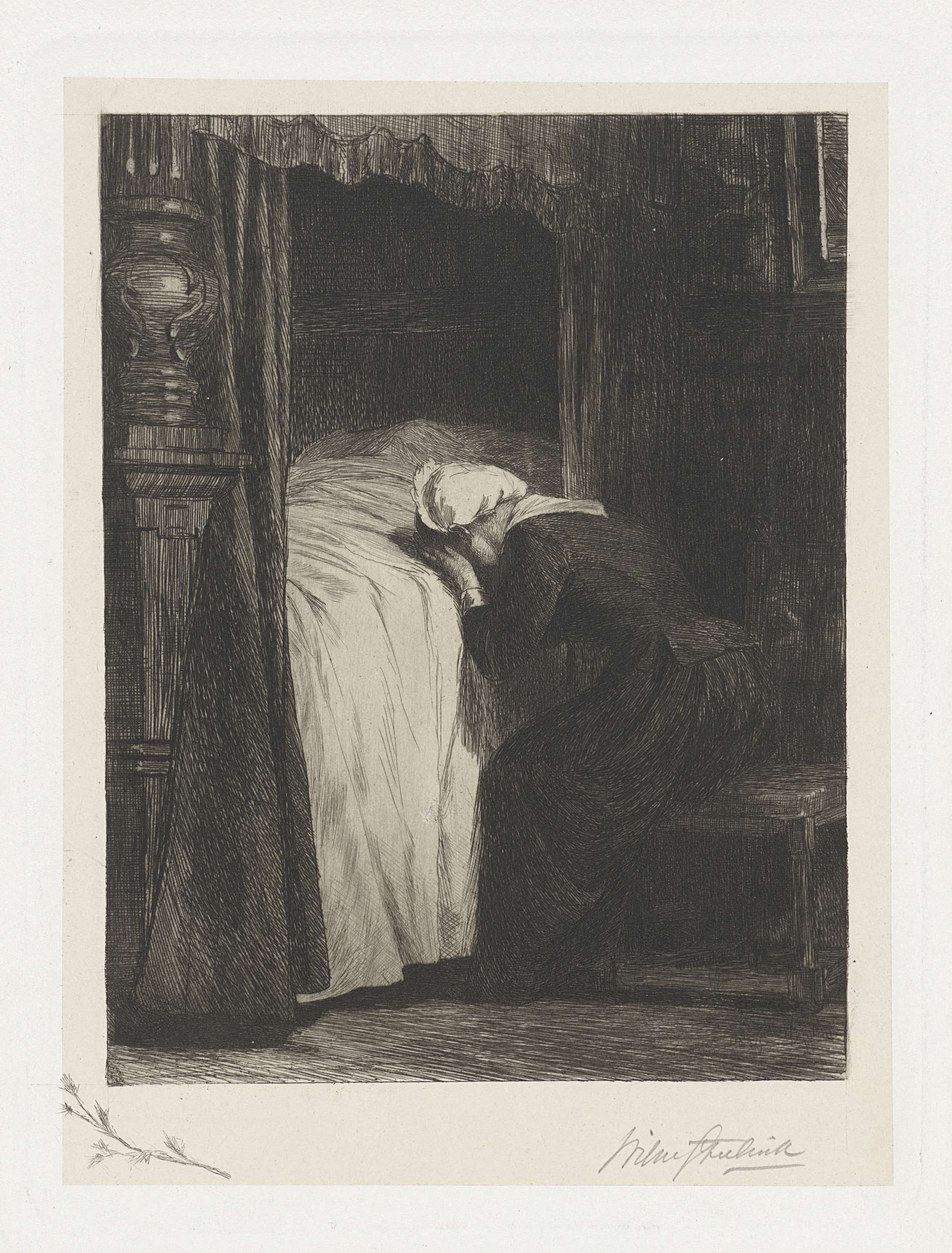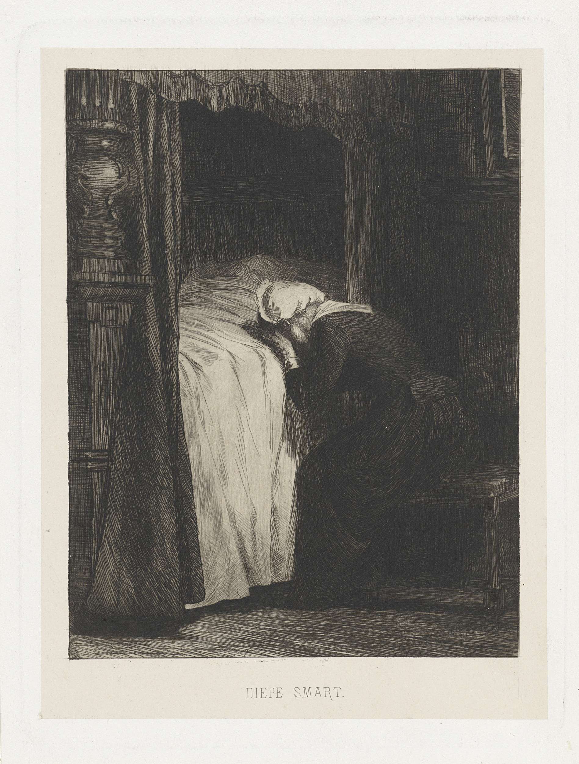 Huilende vrouw bij een bed