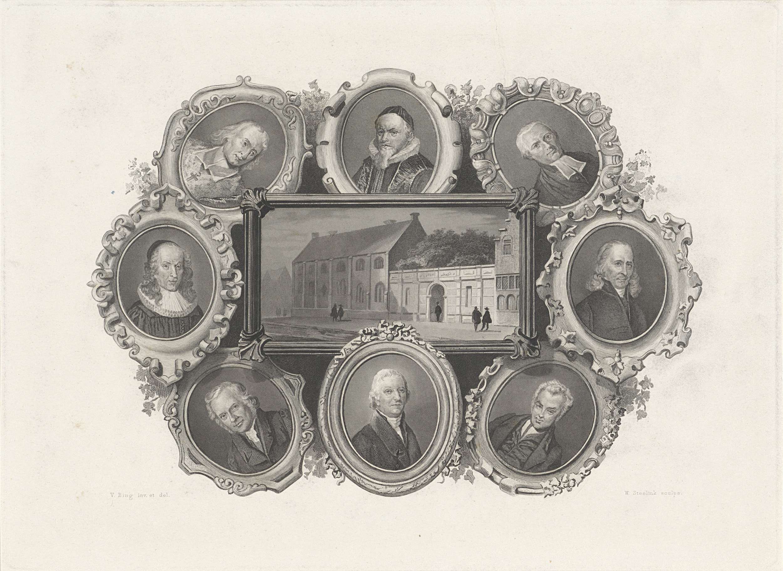 Academiegebouw te Leiden en portretten van leidse pr...