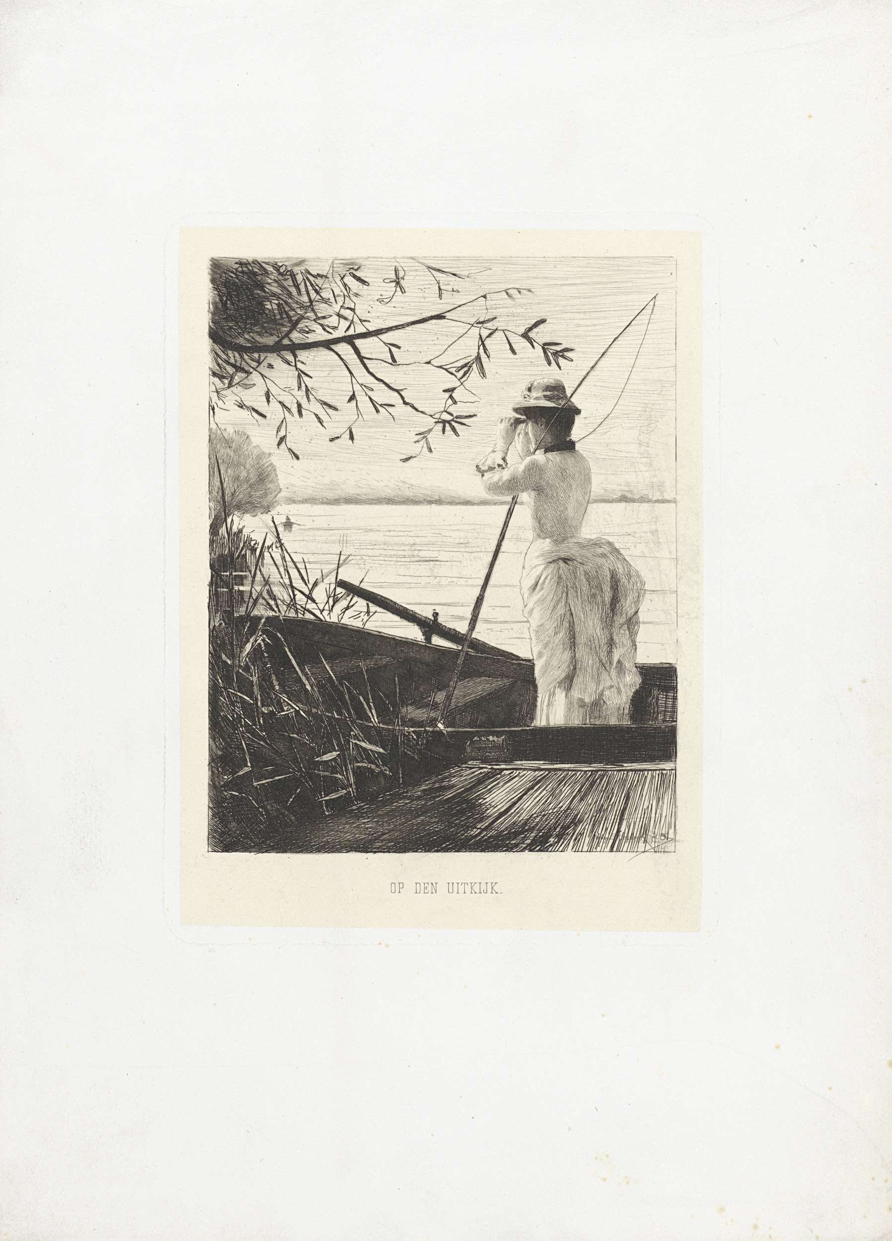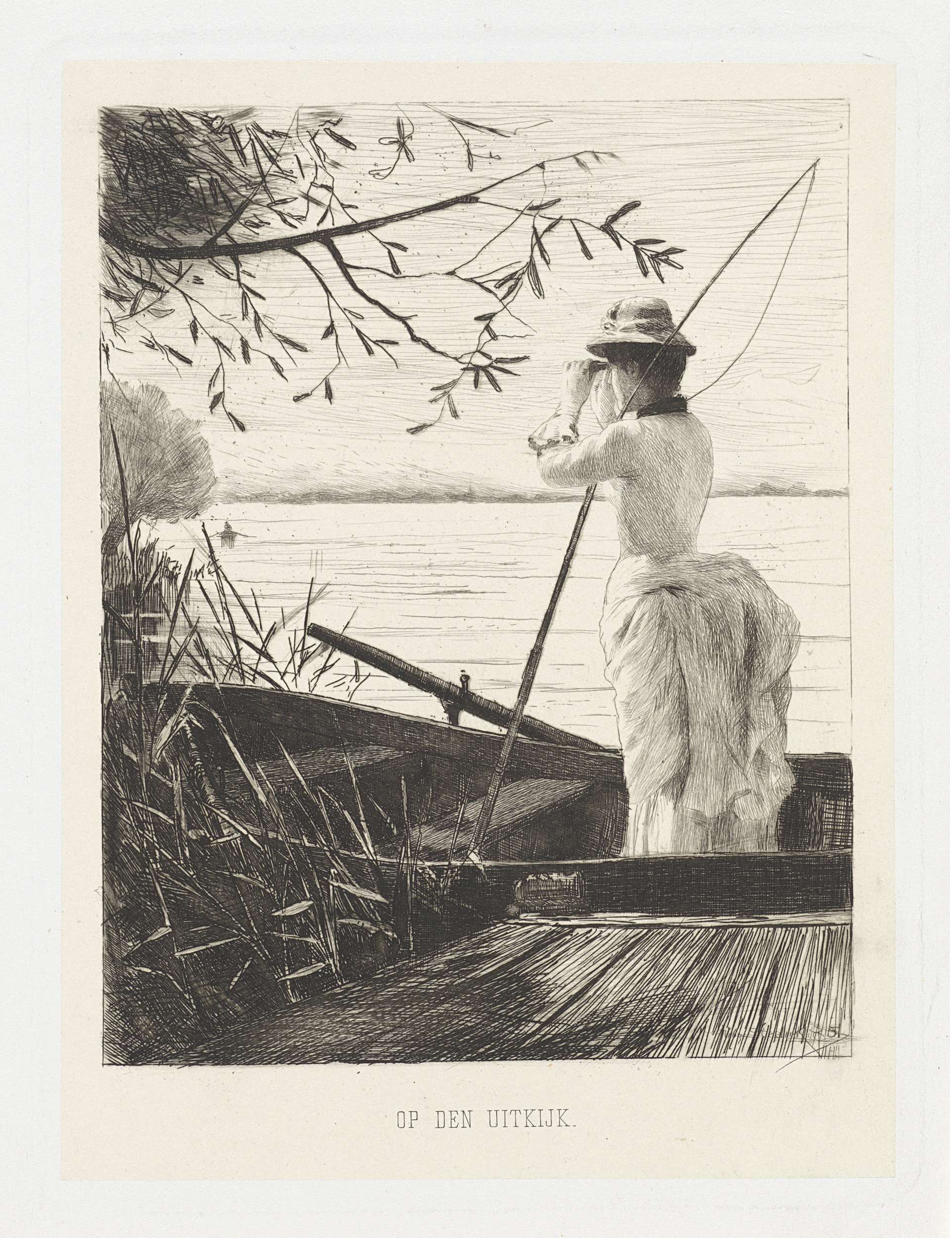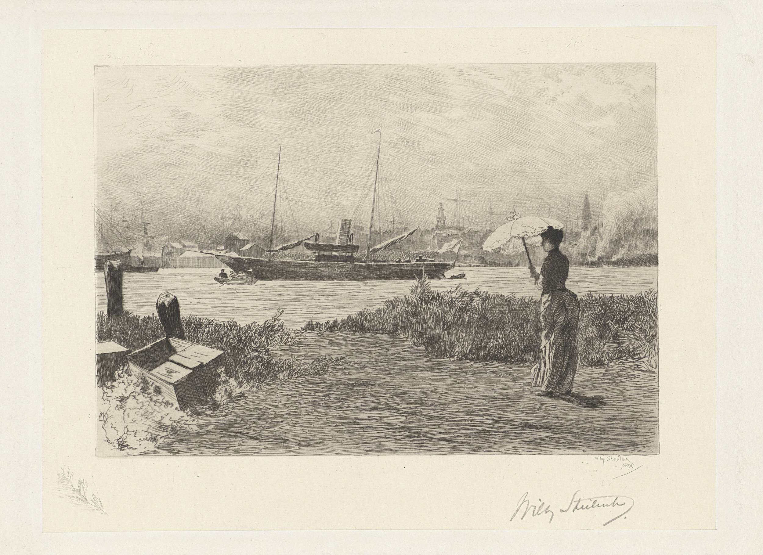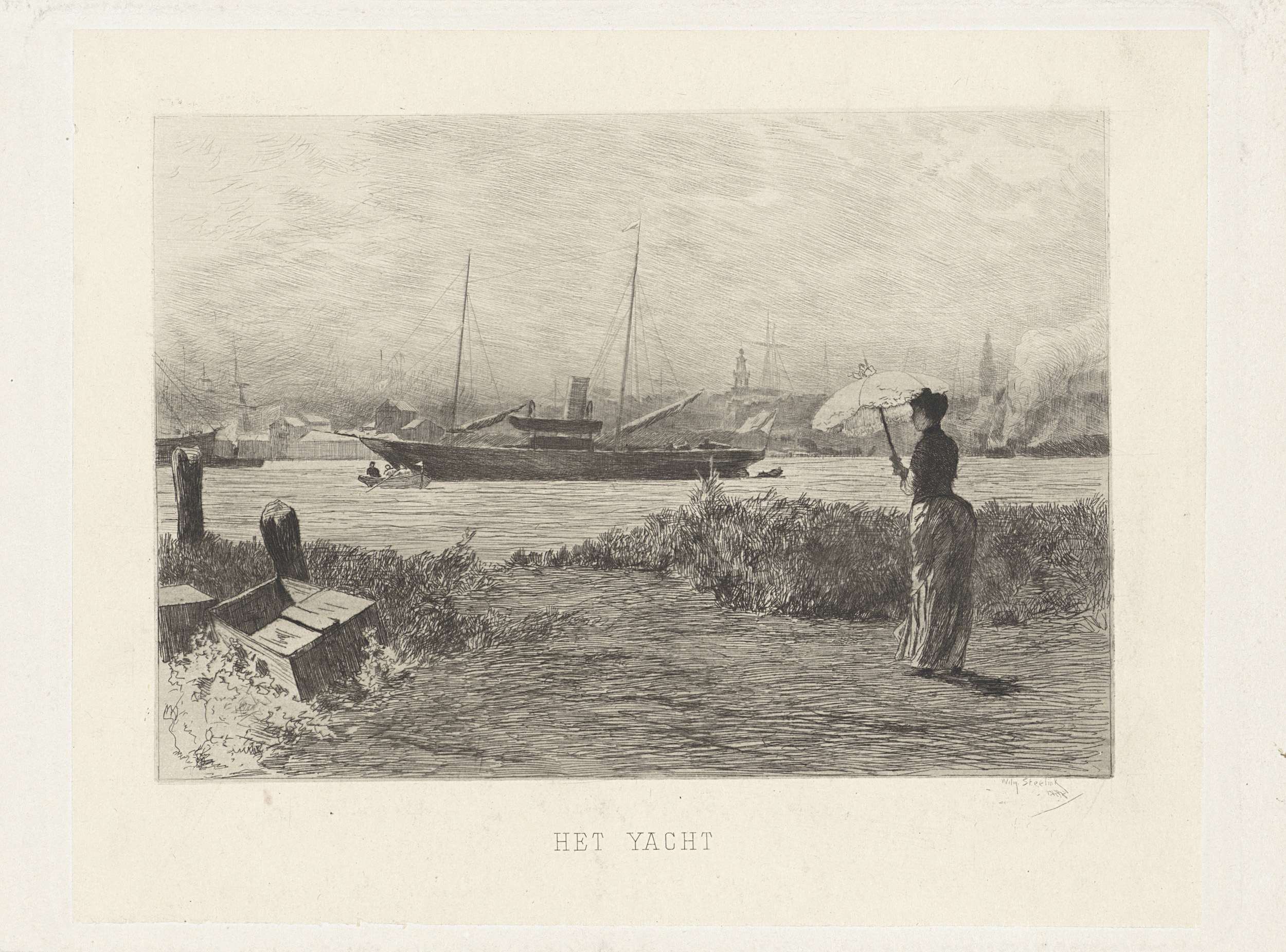 Vrouw met parasol kijkend naar een jacht