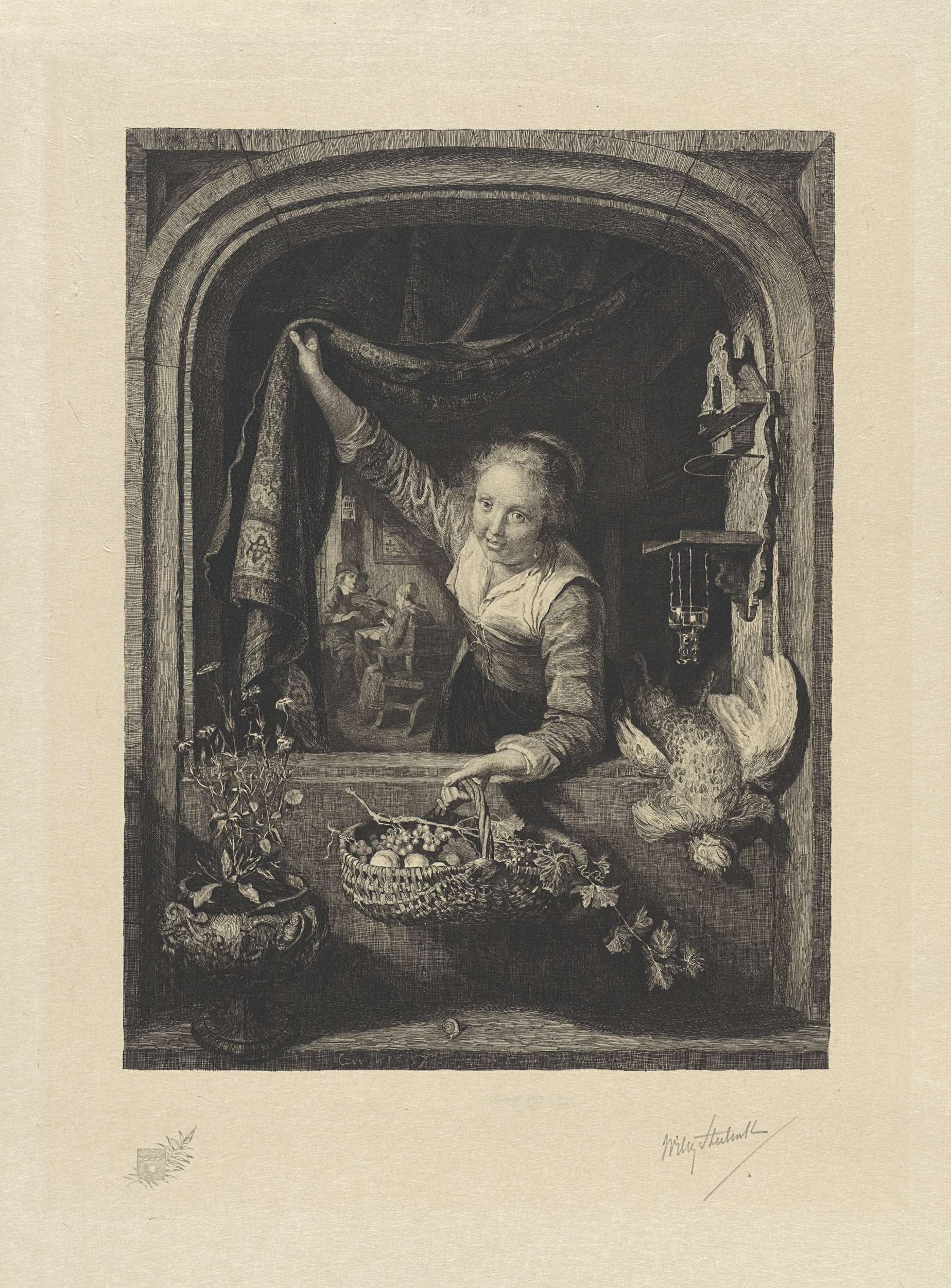 Vrouw met fruitmand in venster