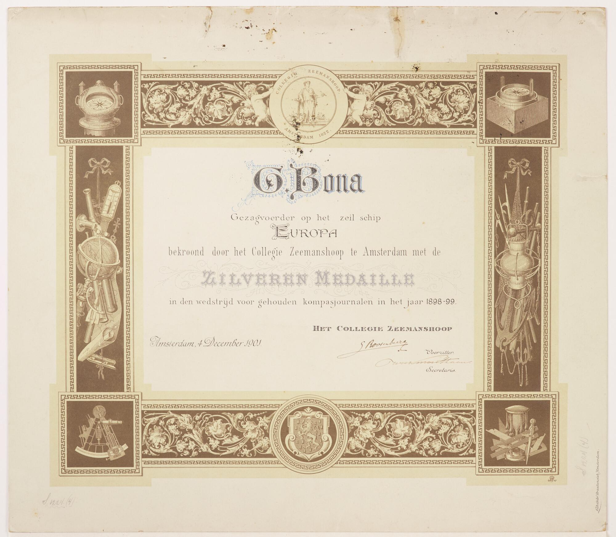 Diploma bij de zilveren medaille, uitgereikt door he...