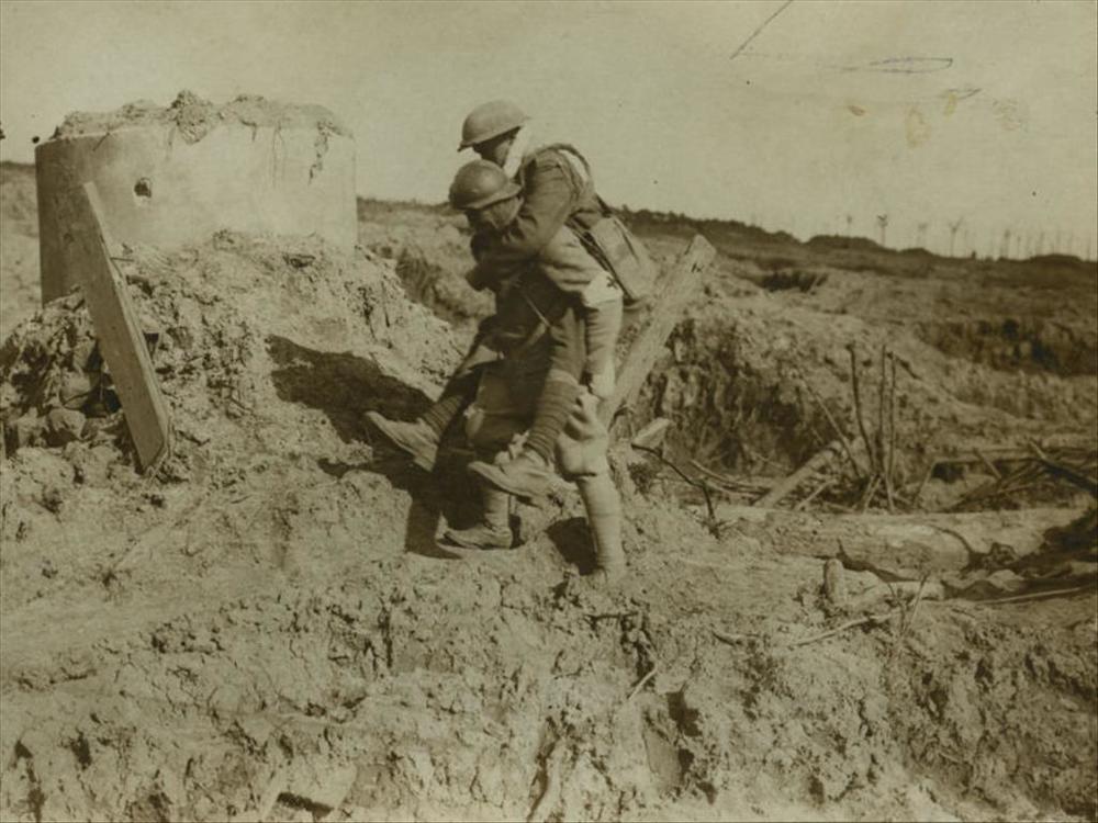 WO I; gewonde Britse militair wordt weggedragen door...