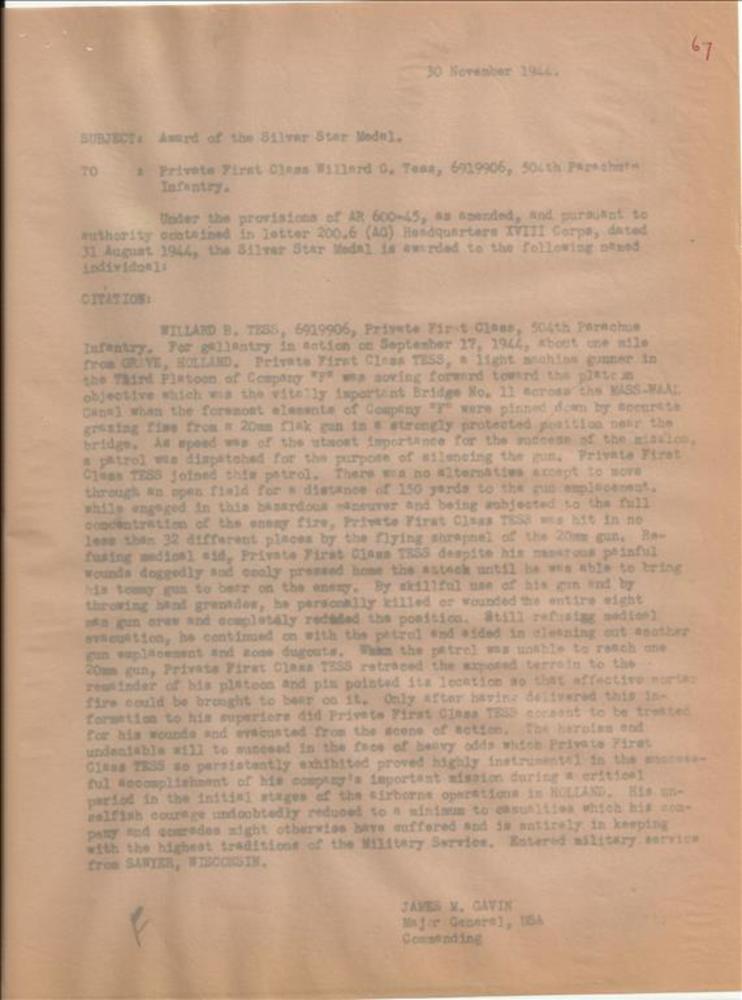 Brief van James Gavin betreffende Silver Star Medal ...