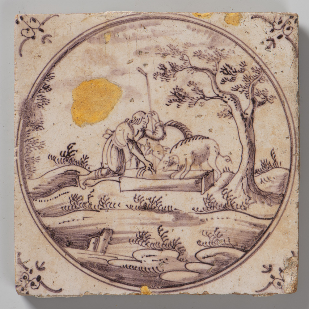 Tegel van aardewerk met tinglazuur, voorstellende: D...