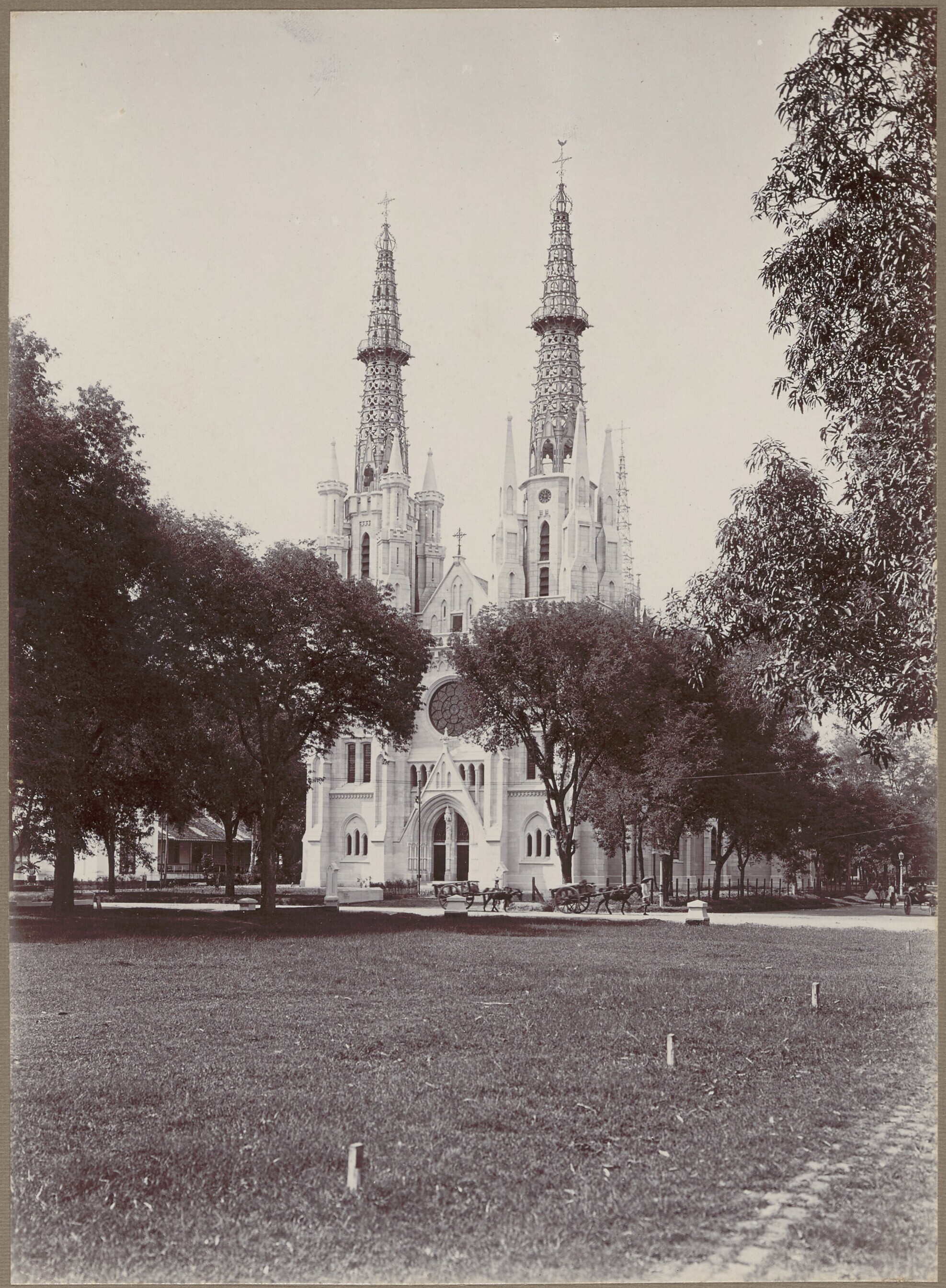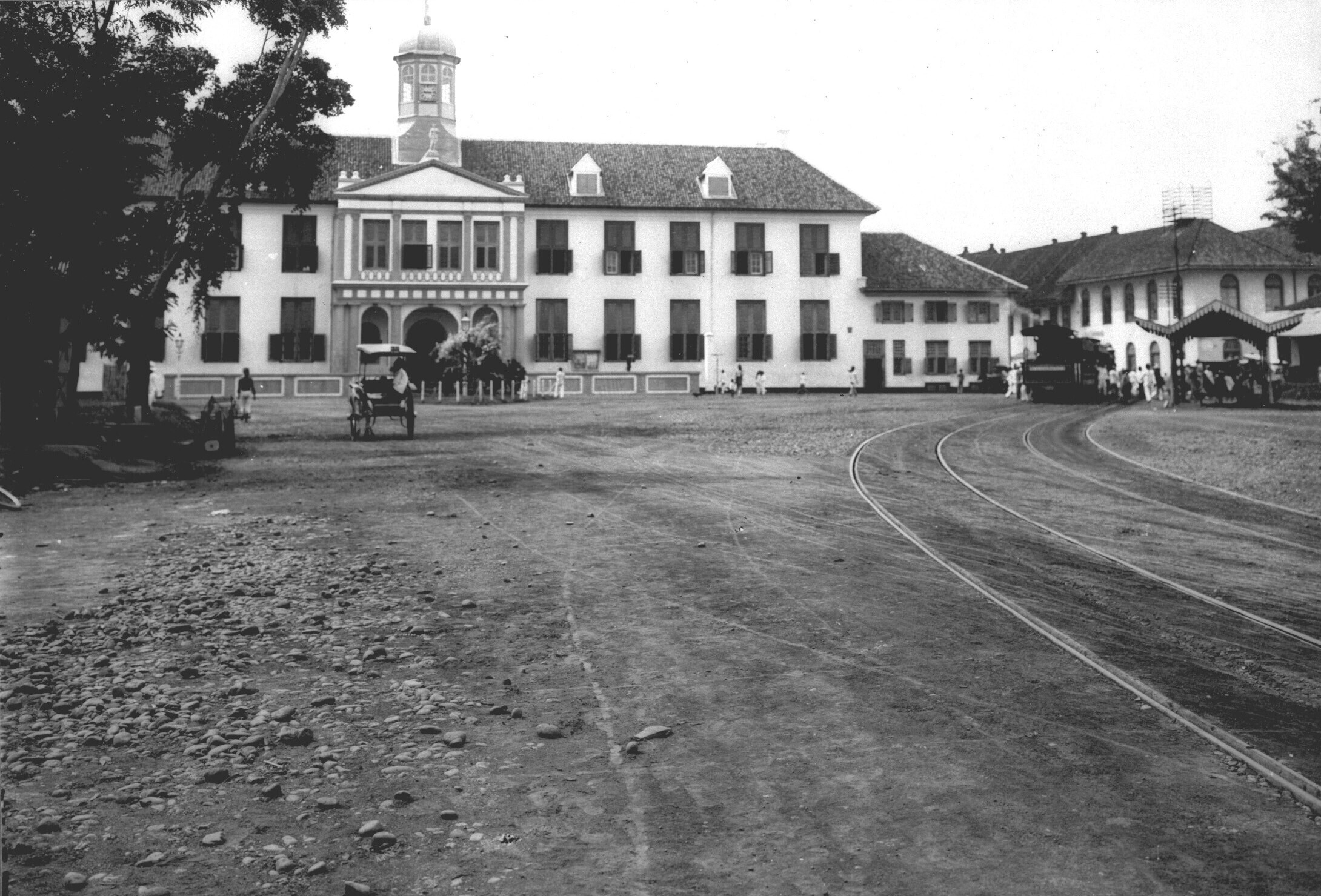 Gezicht op het stadhuis van Batavia en de tramhalte