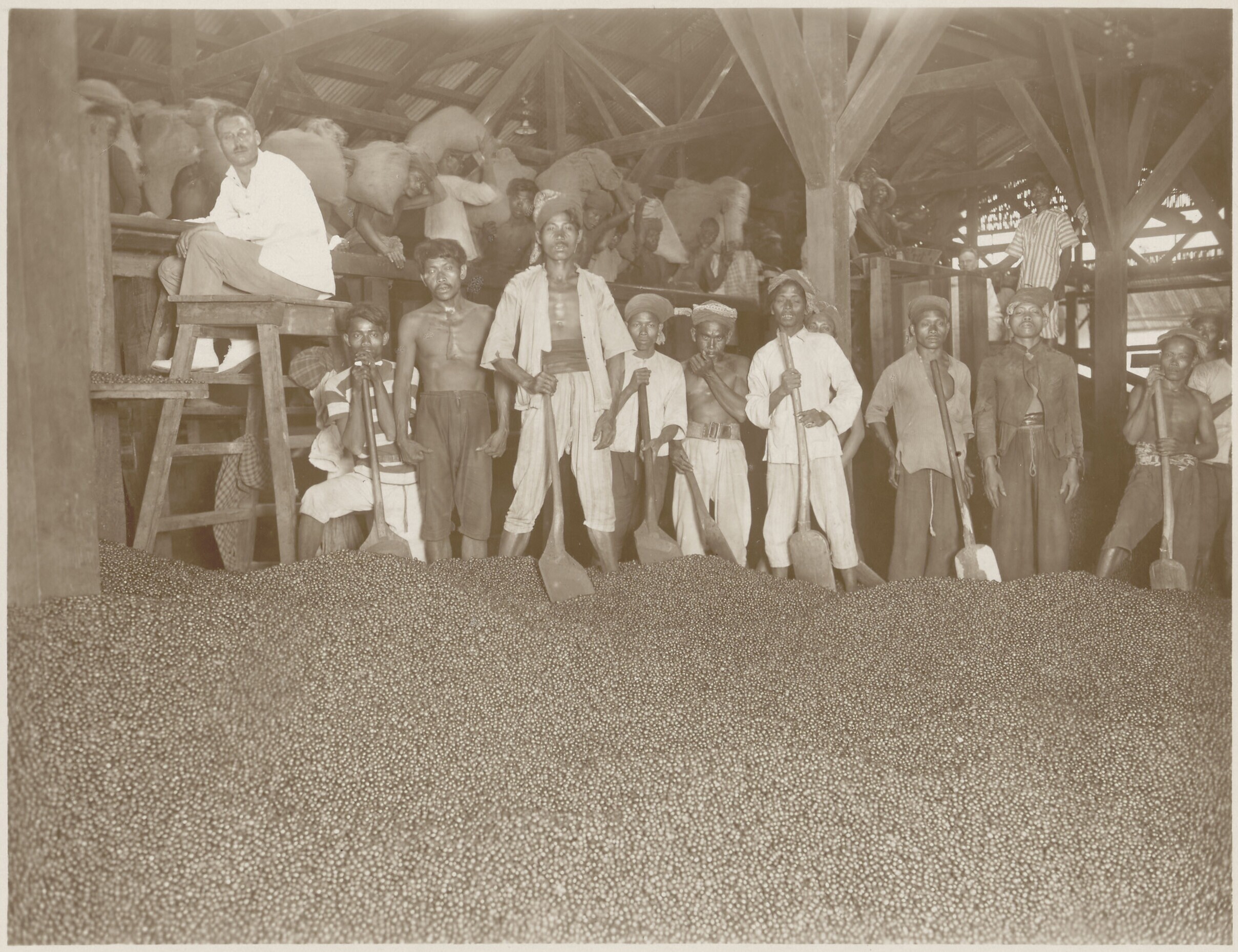 Group portrait of labourers with the harvested coffe...