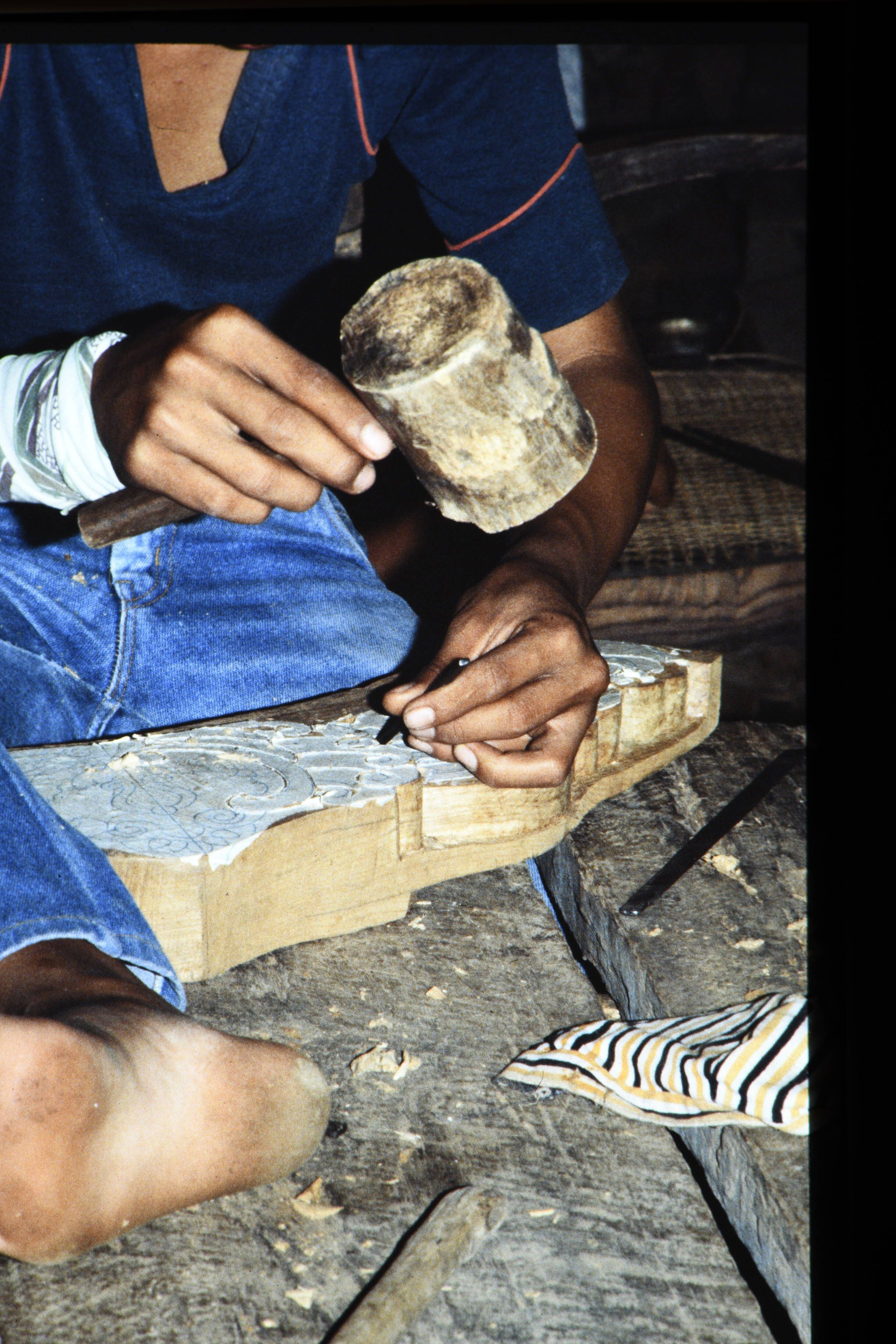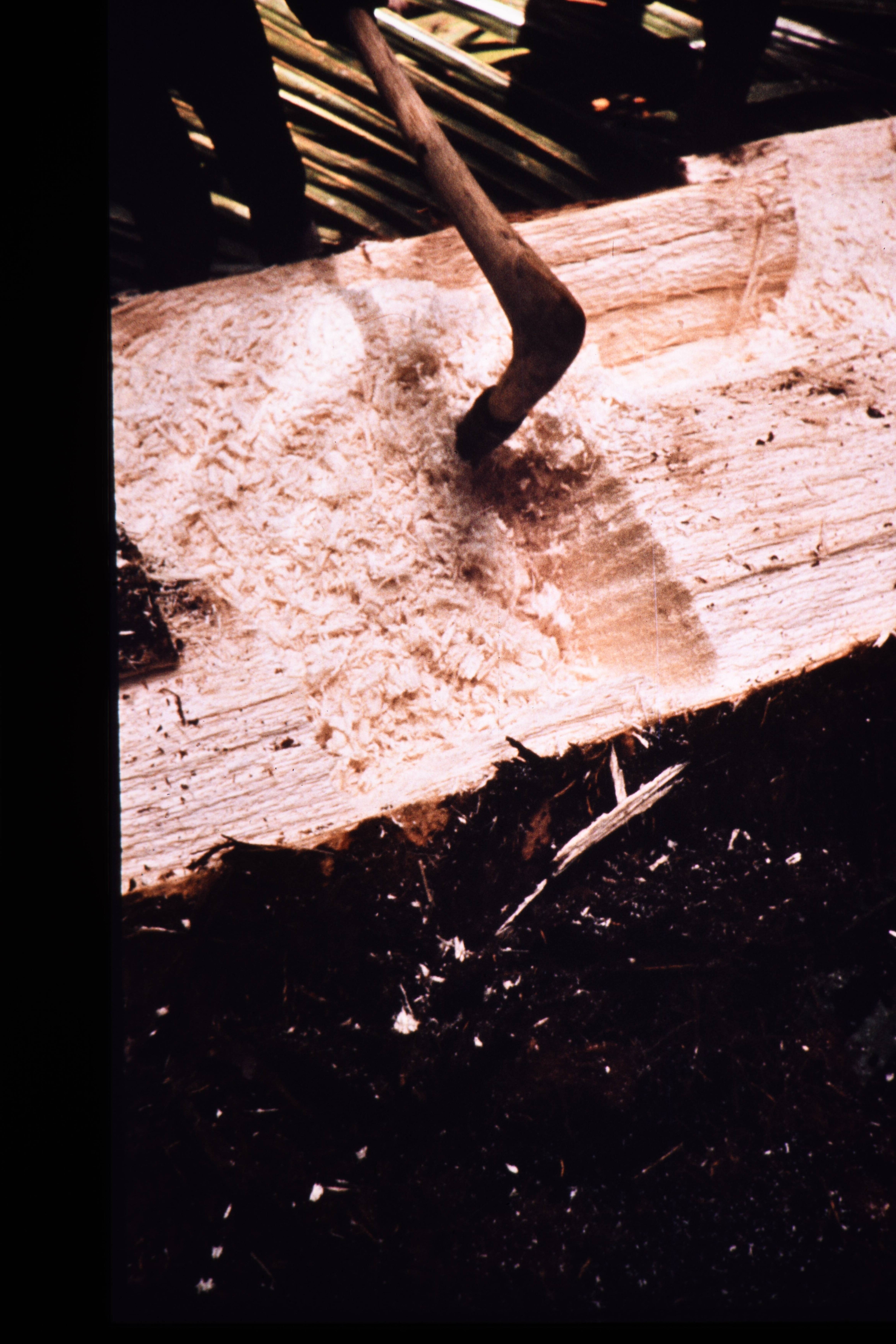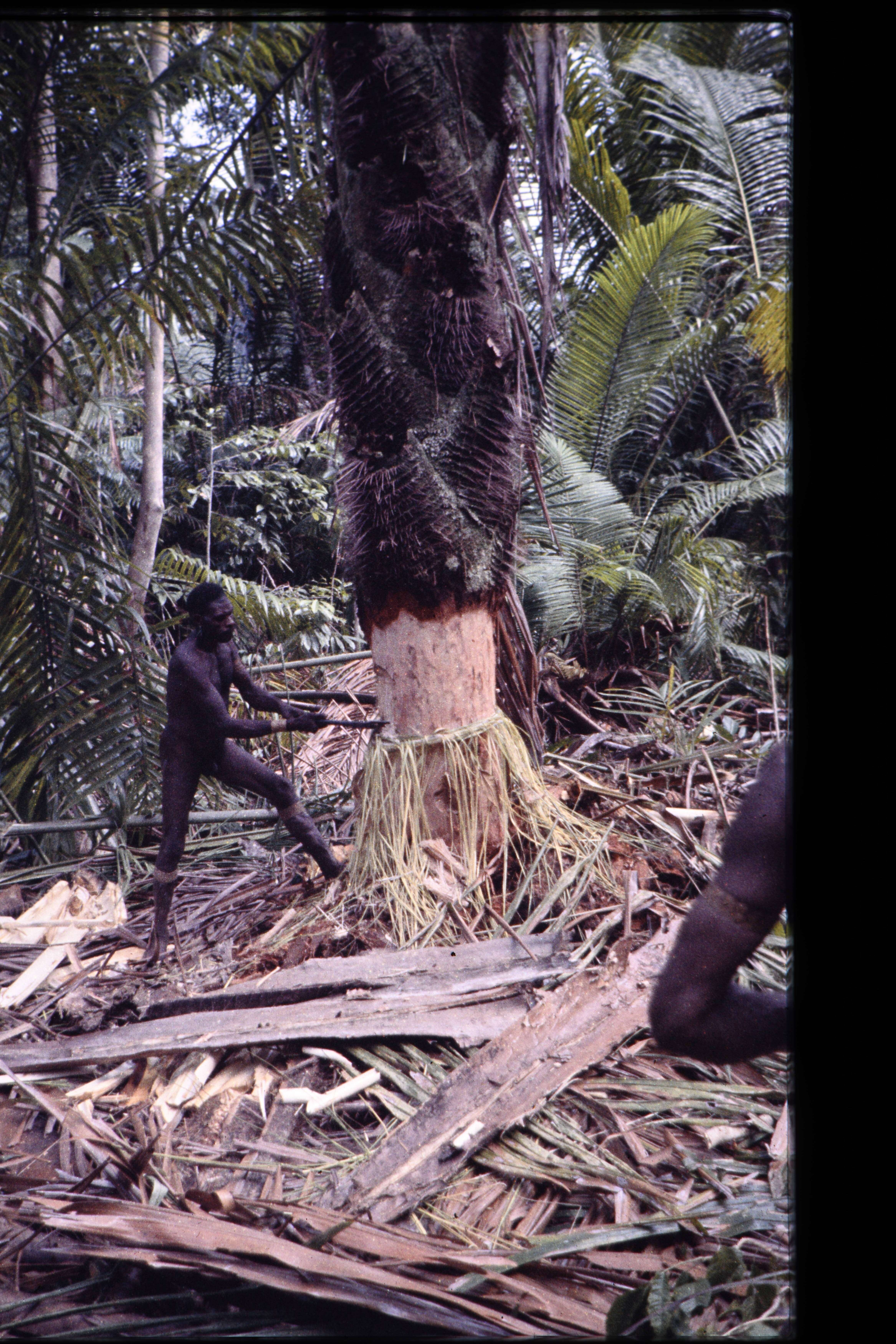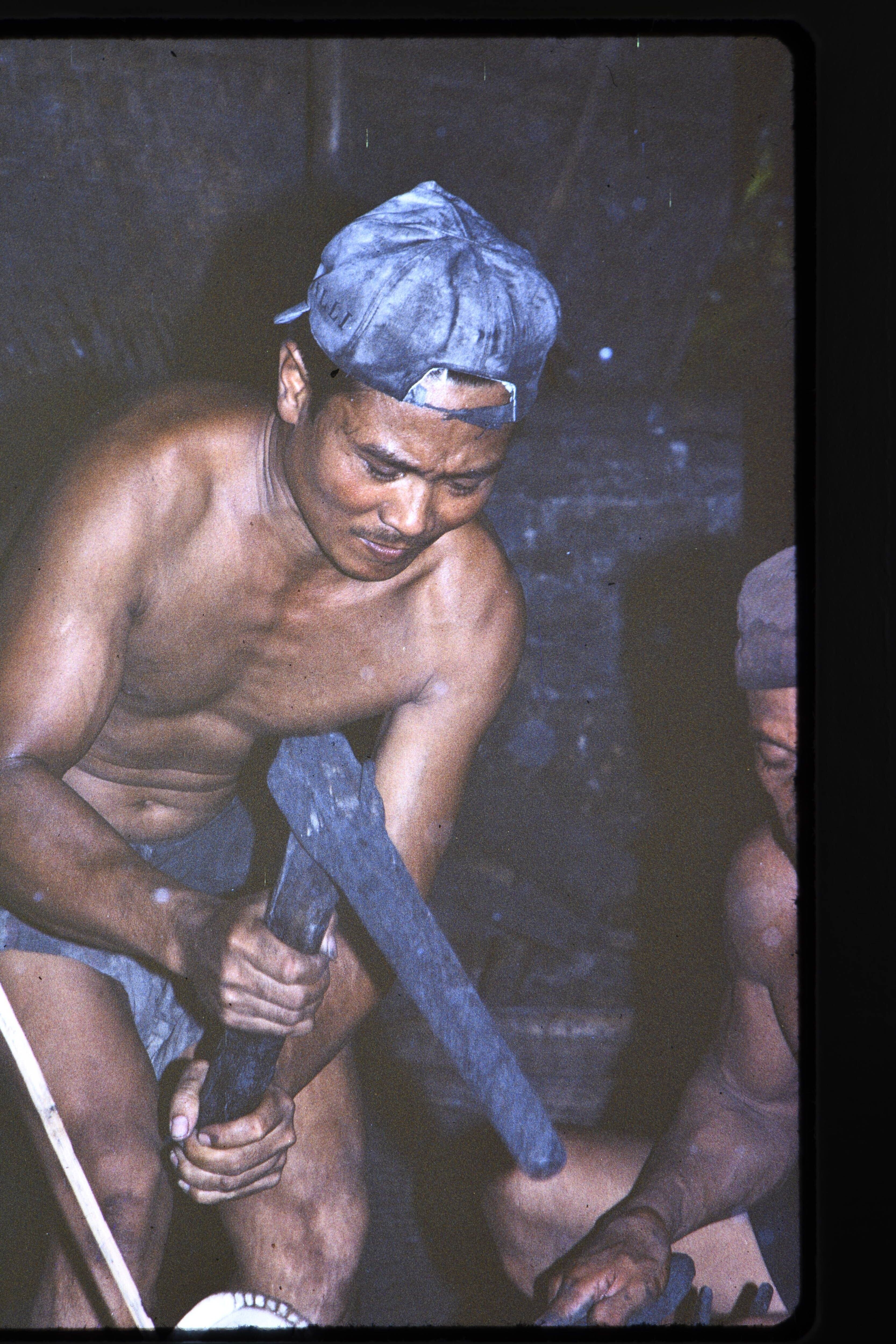 Detail van losgeklopt stuk sago met klopper.