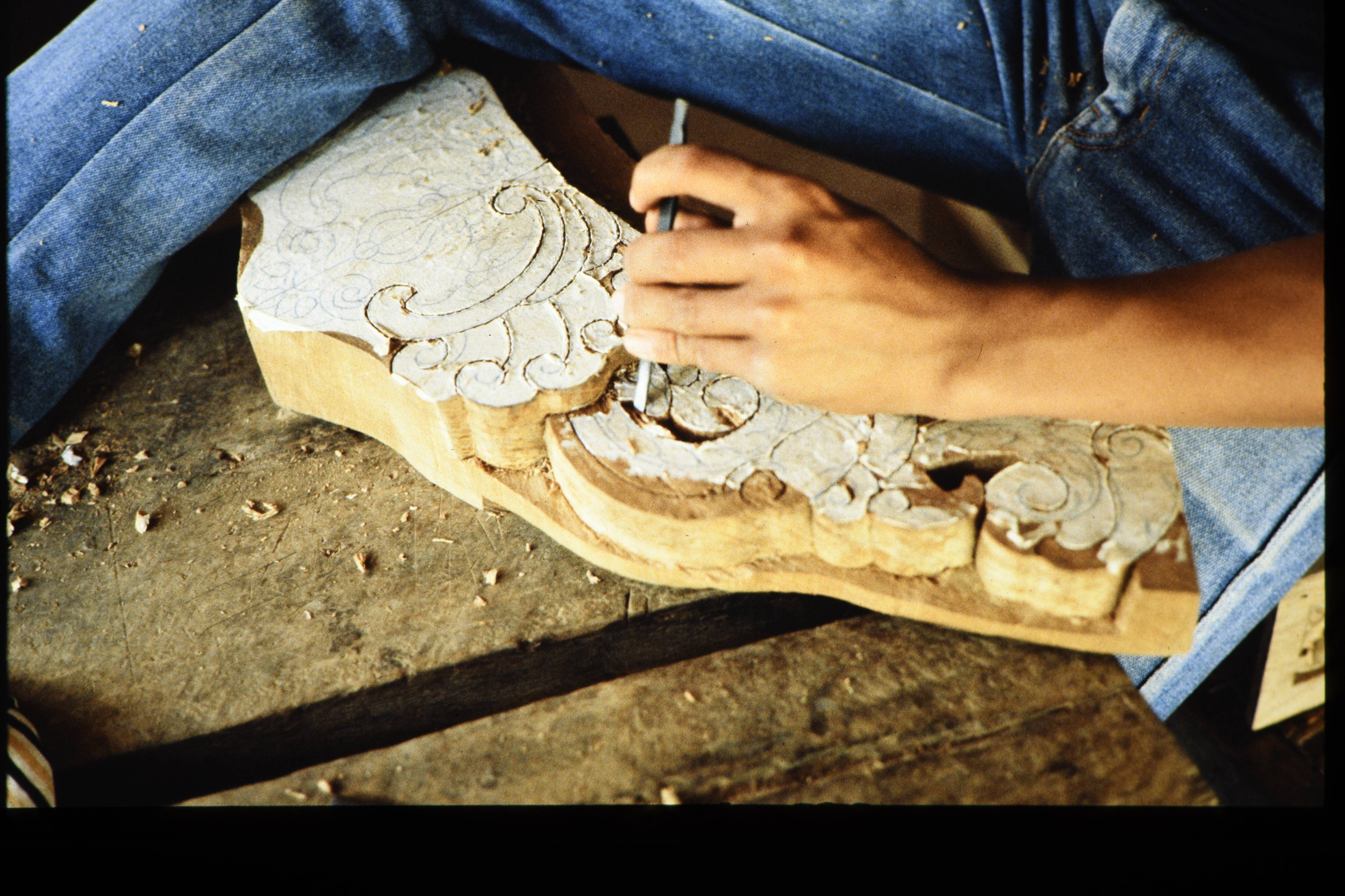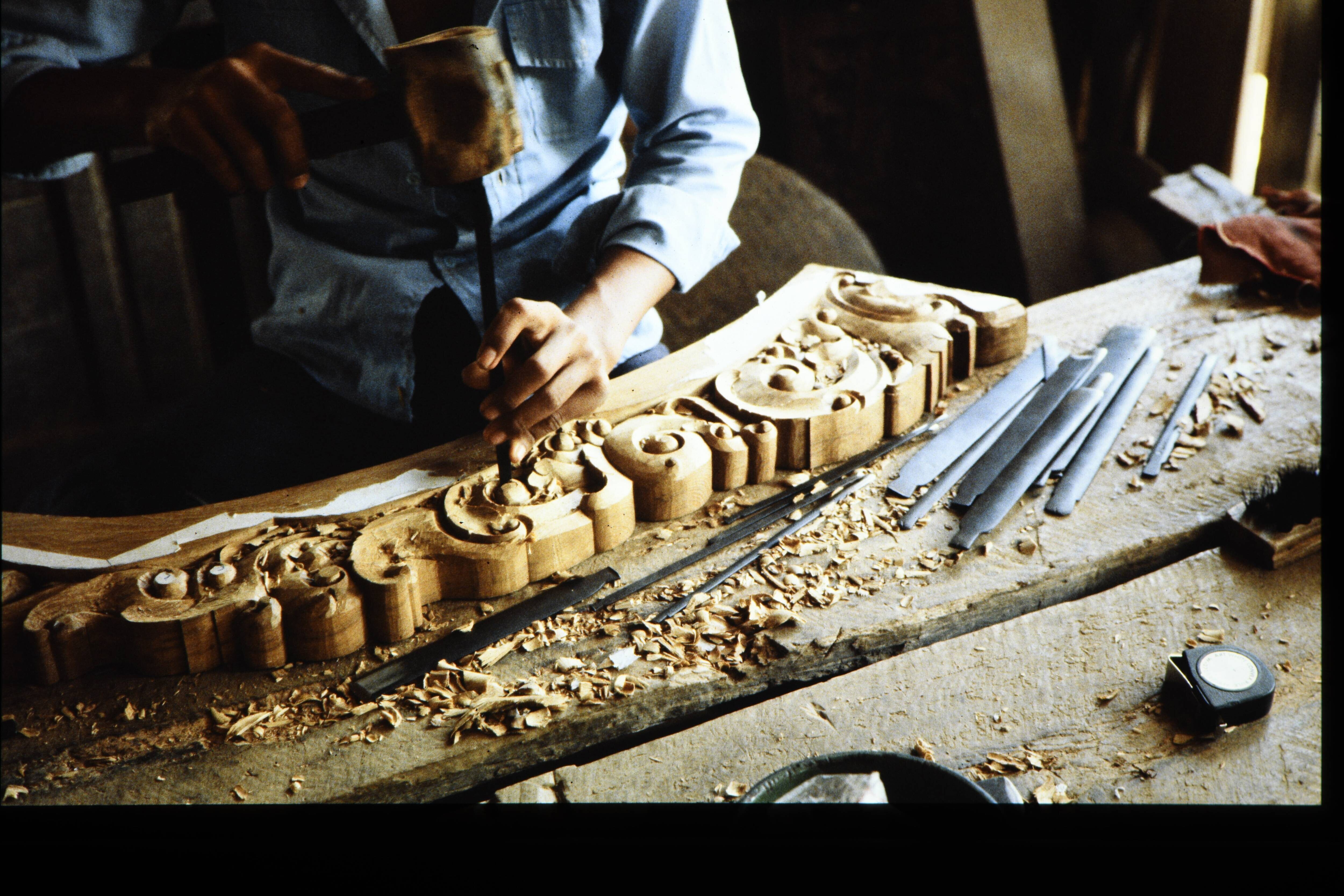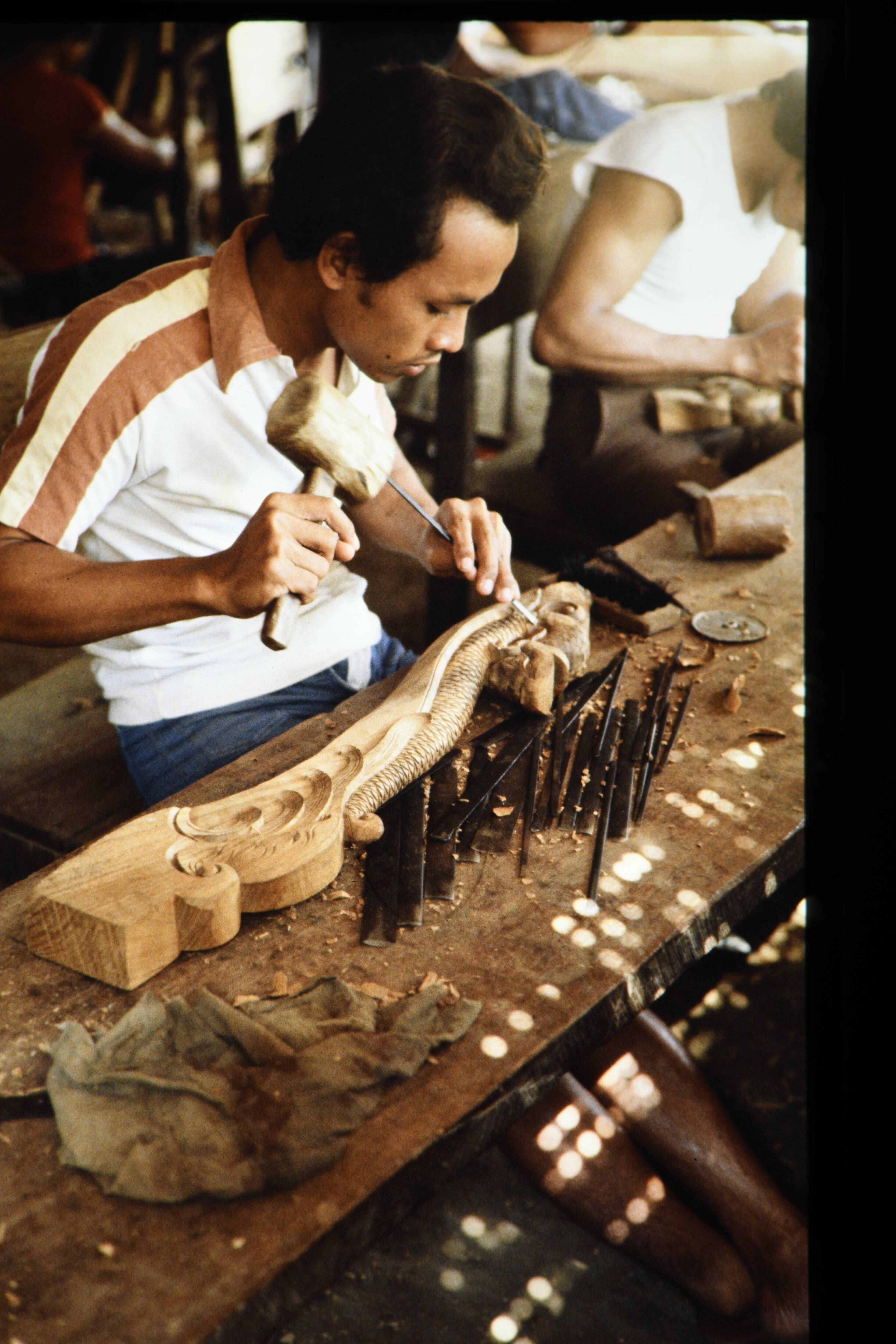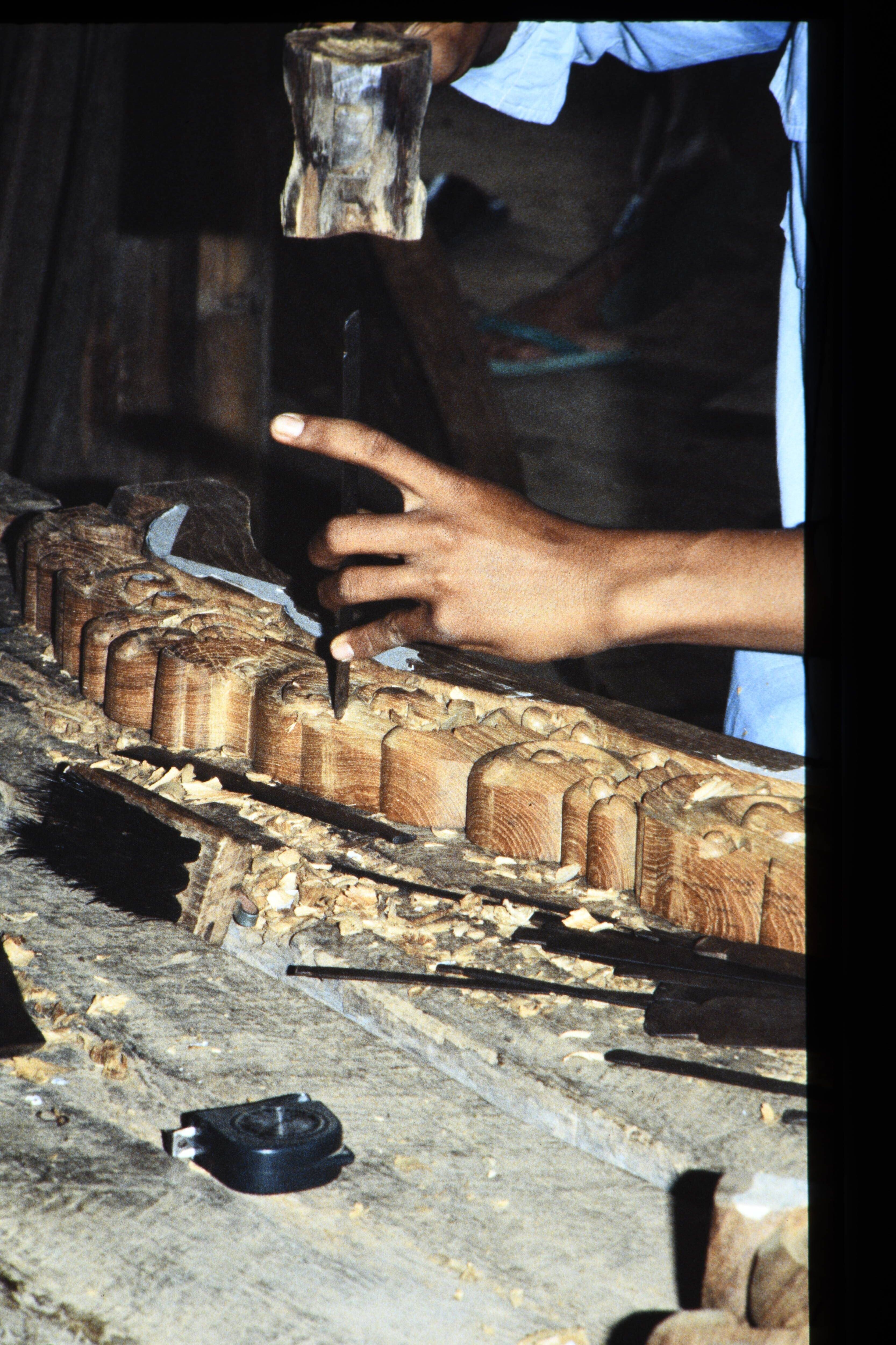 Detail van losgeklopt stuk sago met klopper.