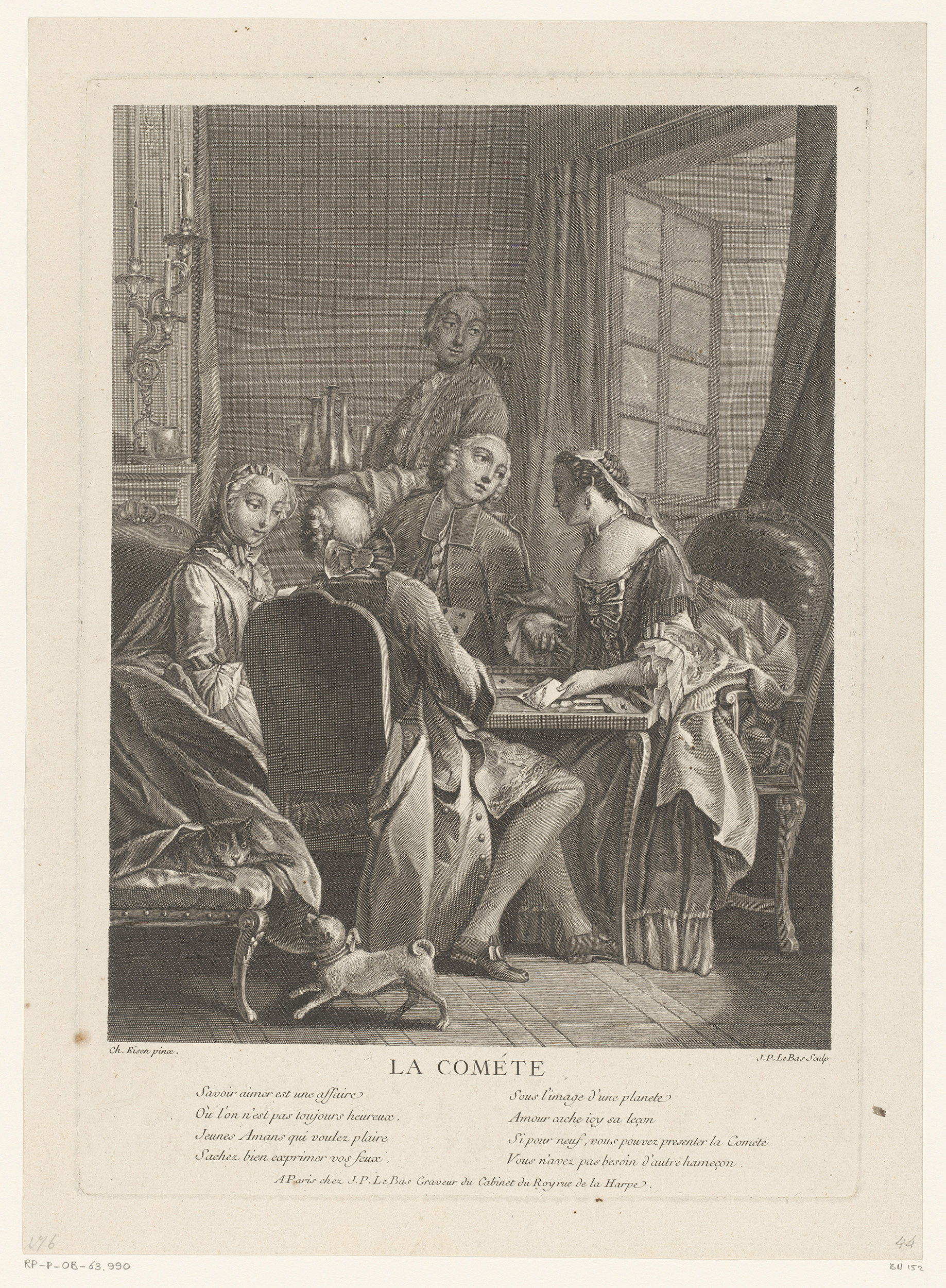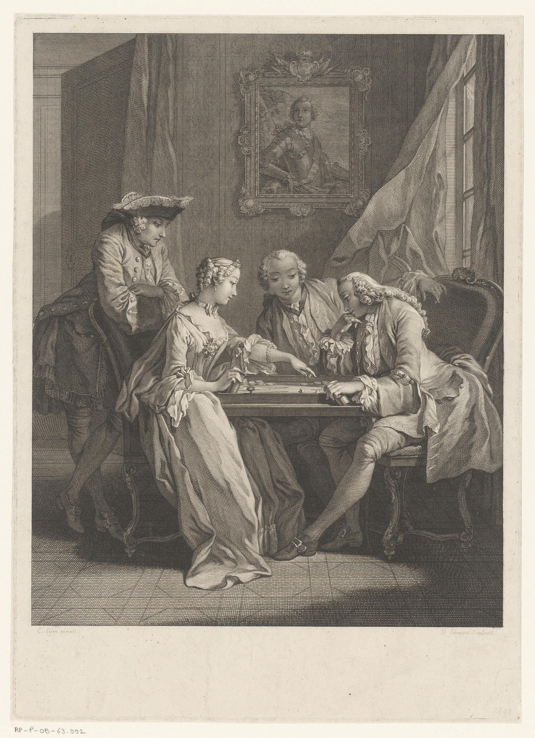 Kaartspelend gezelschap met Lodewijk XV in een salon