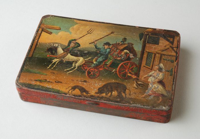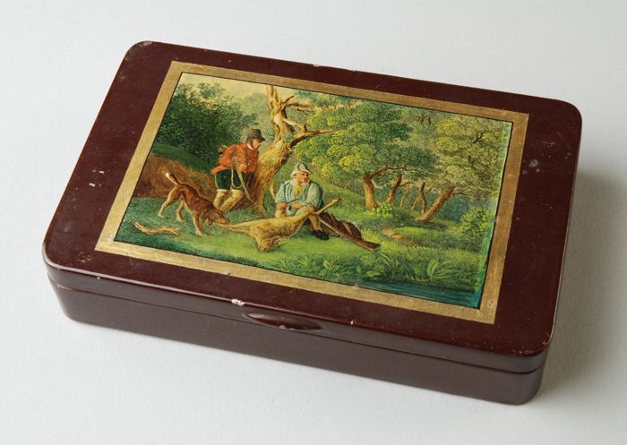 IJzeren tabaksdoos, beschilderd met jachttafereel