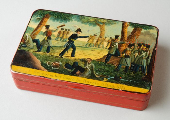 IJzeren tabaksdoos, beschilderd met "gevegt in het b...