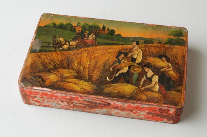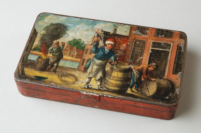 IJzeren tabaksdoos, beschilderd met drie kuipers