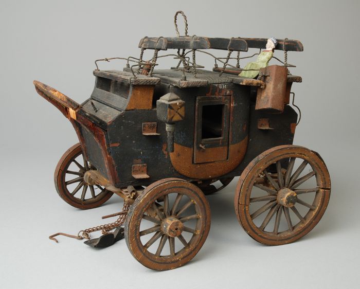 Houten postkoets, bovenop vier zitbanken en passagie...