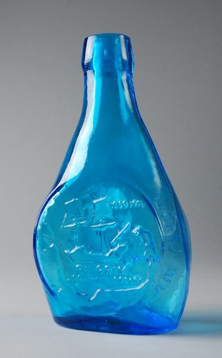 Lichtblauwe glazen fles met zeilschip en "1620 - 197...