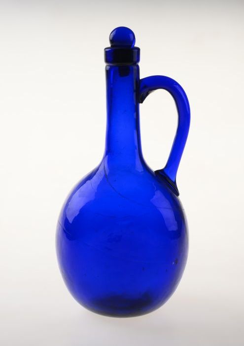 Blauwe schenkfles, karaf met handvat en stopper